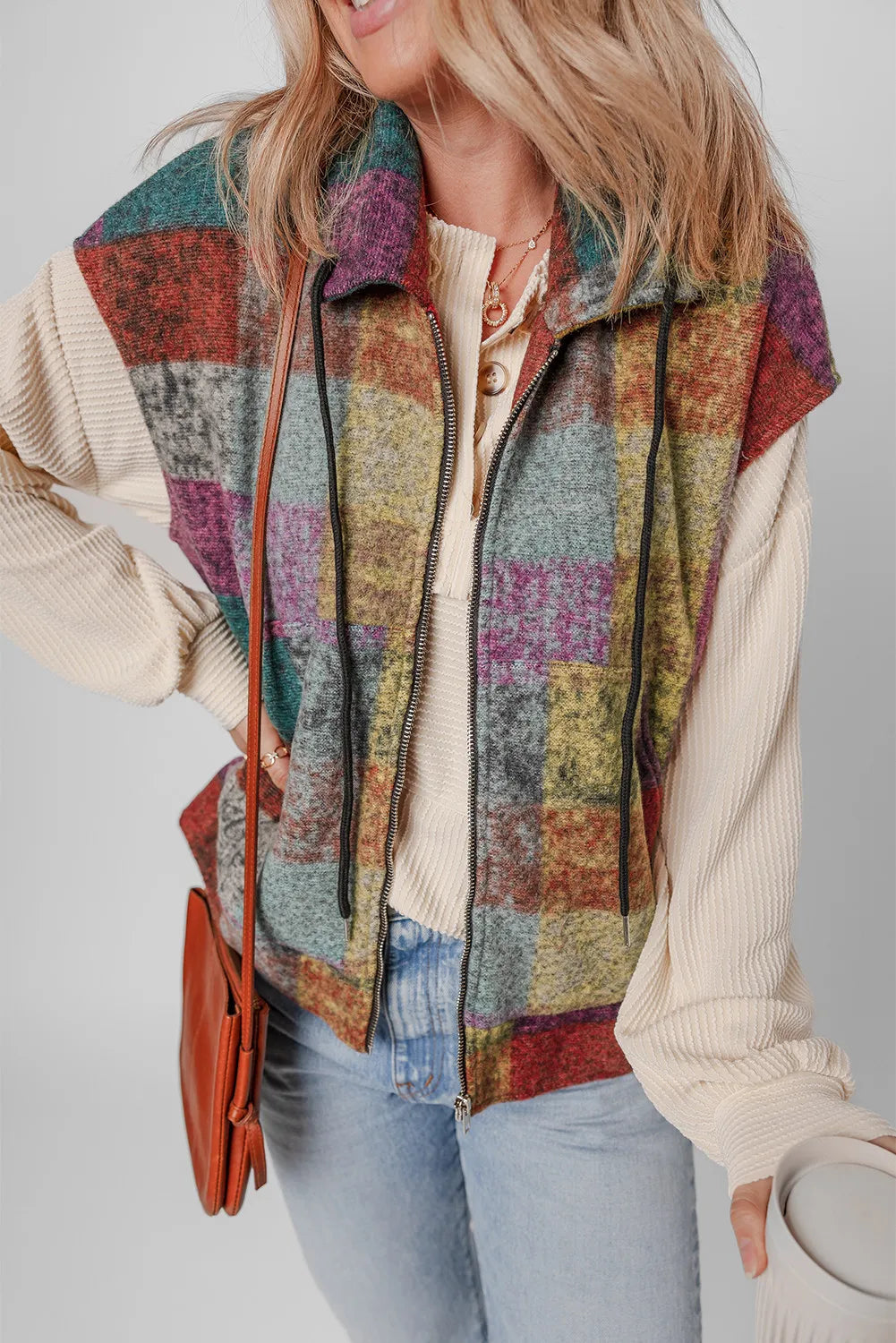 Plaid Zip Up Collared Neck Vest Coat