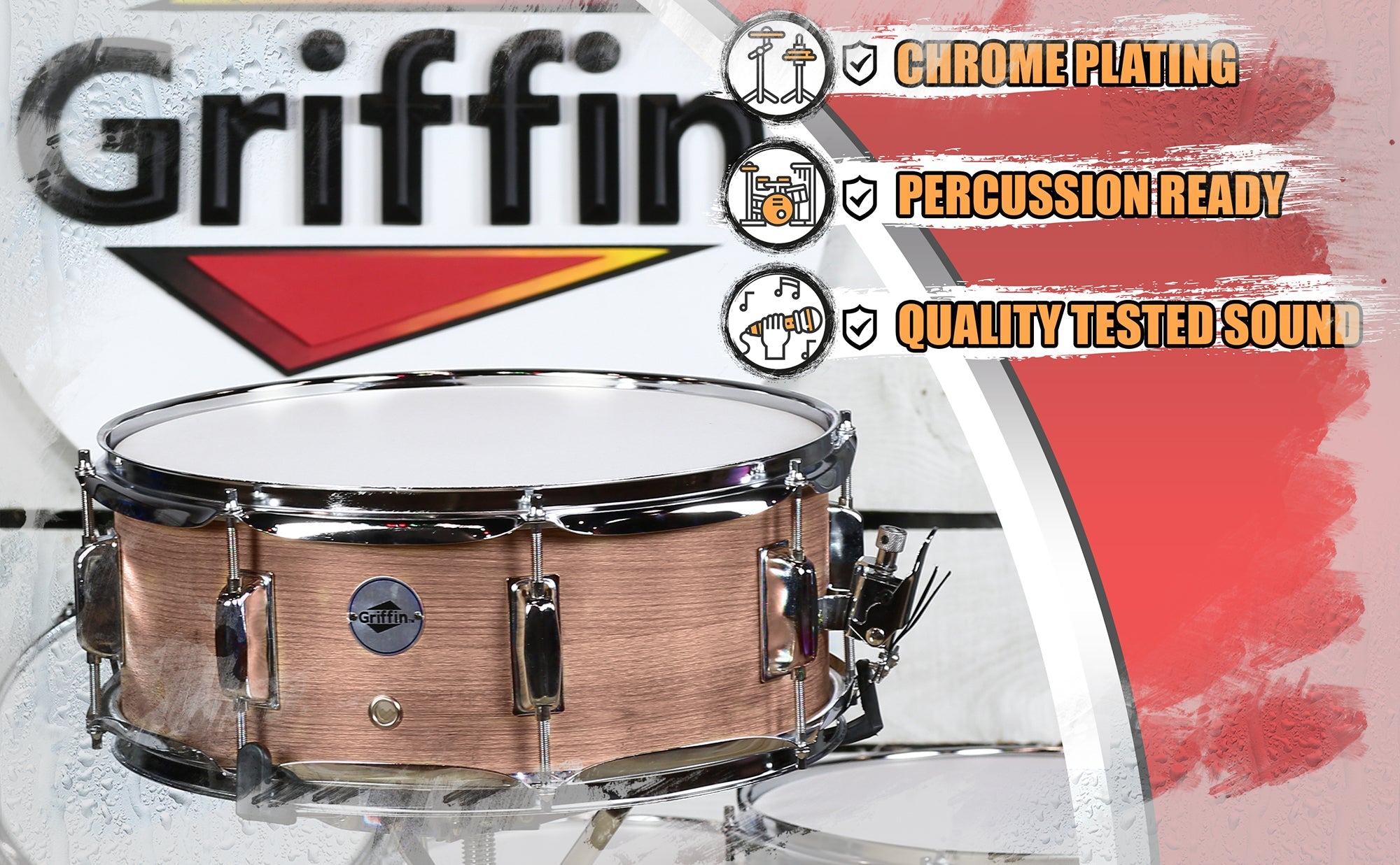 With a sharp, aggressive attack and a powerful punch, this wood snare drum from Griffin will give you the sound you crave. Outfitted with 8 tuning lugs for superior stability and sound quality compared to other 6-lug drums, you won't find a better drum around. Dial in exactly the sound you want with the snare drum throw-off and every purchase also includes a drum key for you to tighten, loosen, or mute the snares as desired - so get ready to make your sound sizzle with Griffin!