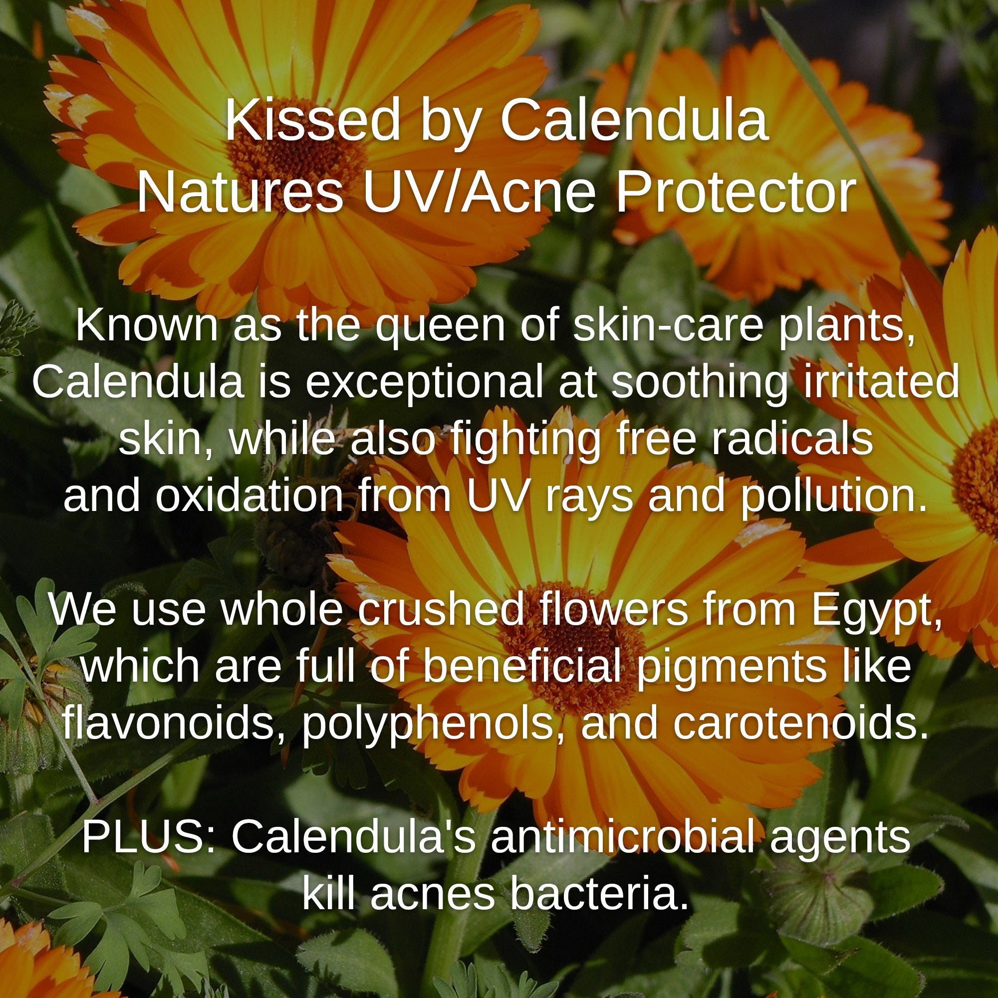 - Calendula Flowers is exceptional at soothing irritated skin, while also fighting free radicals and oxidation from UV rays