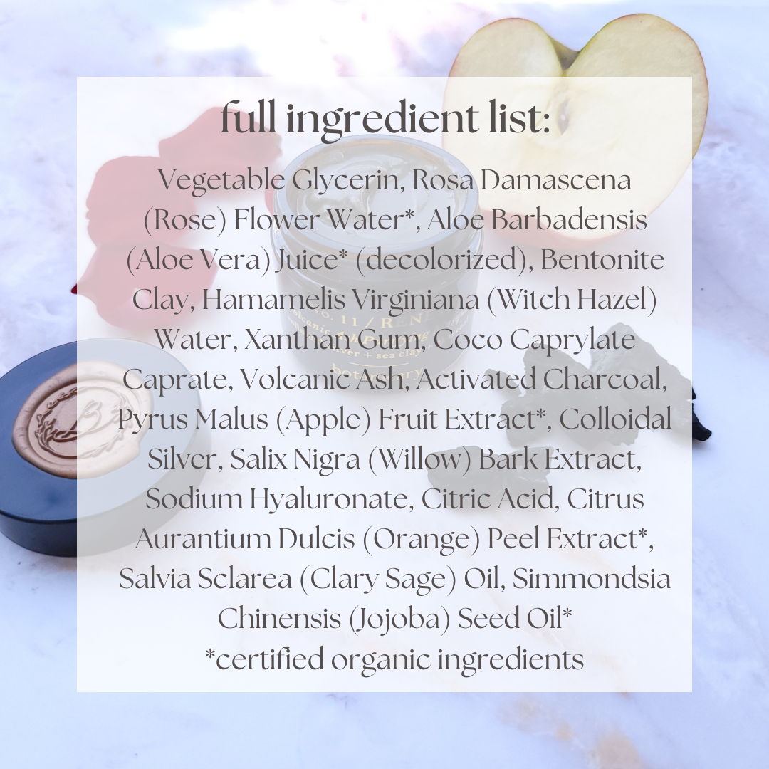 Volcanic Ash & Sea Clay work together to draw out built up dirt, oils and impurities deep in your pores while Colloidal Silver & Activated Charcoal help to purify the skin and minimize the appearance of large pores.