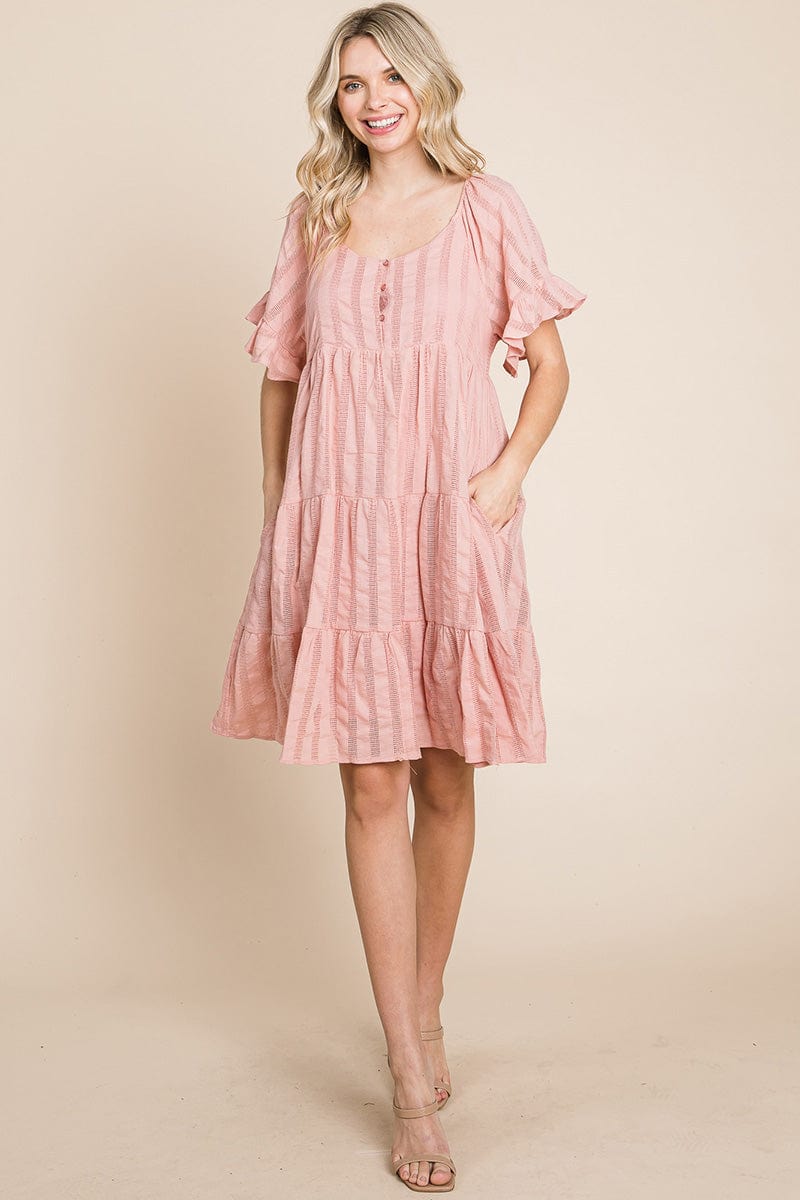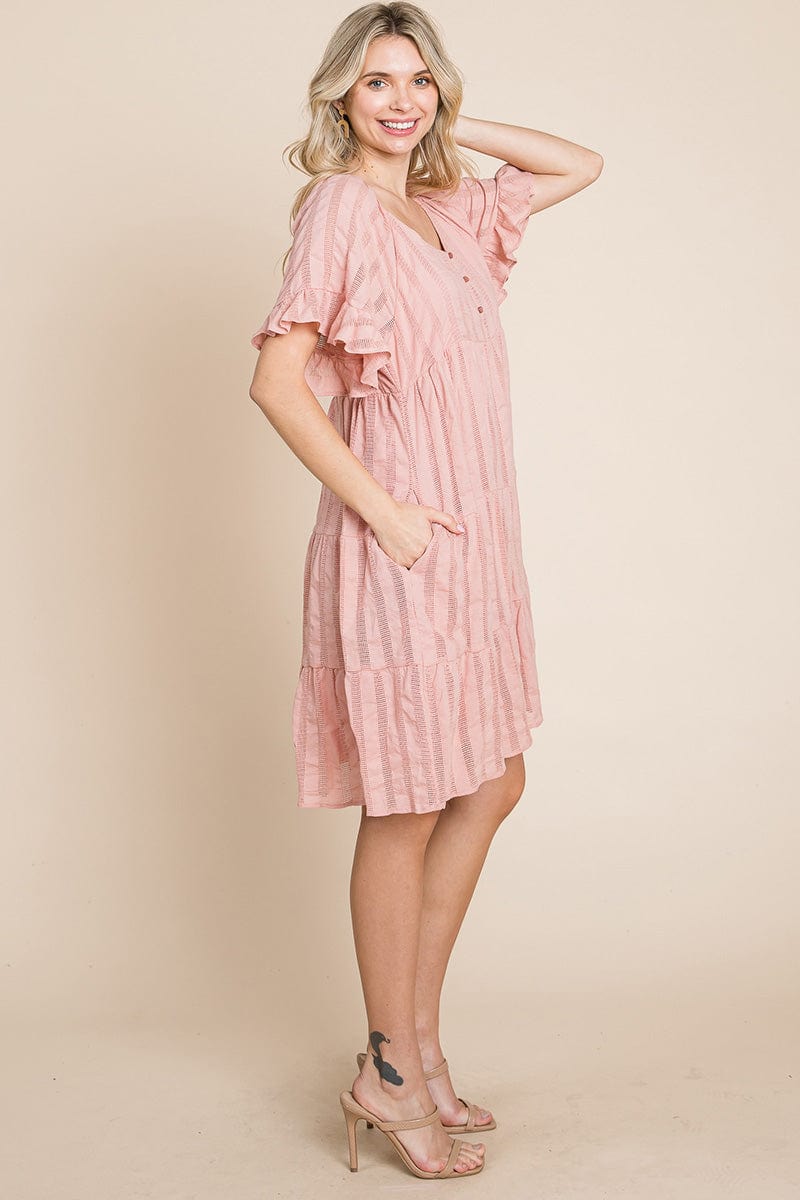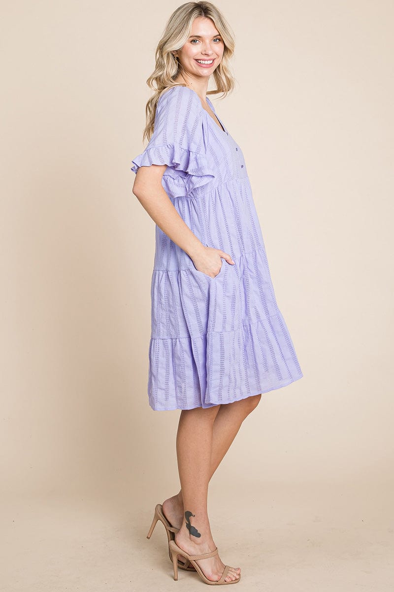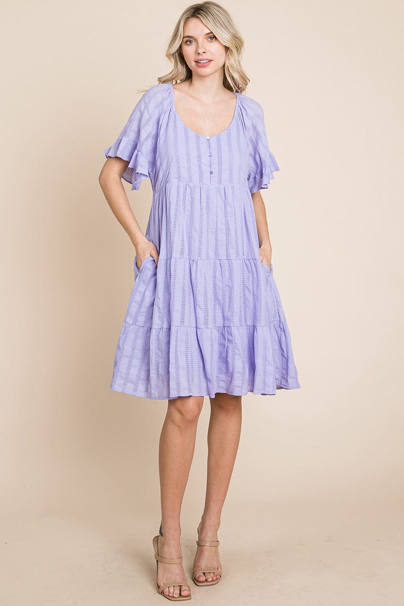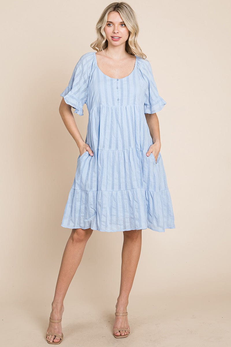 Features: Short Ruffled Sleeve, Boat Neck, Lined, Tiered, Pleated, Knee Length, Button Closure, Striped, Textured, 2 Side Pockets