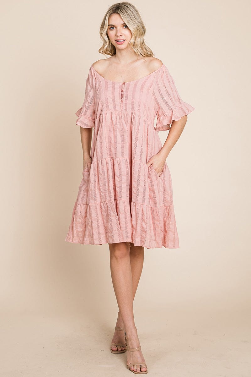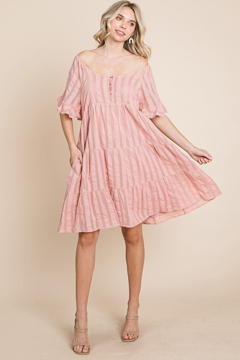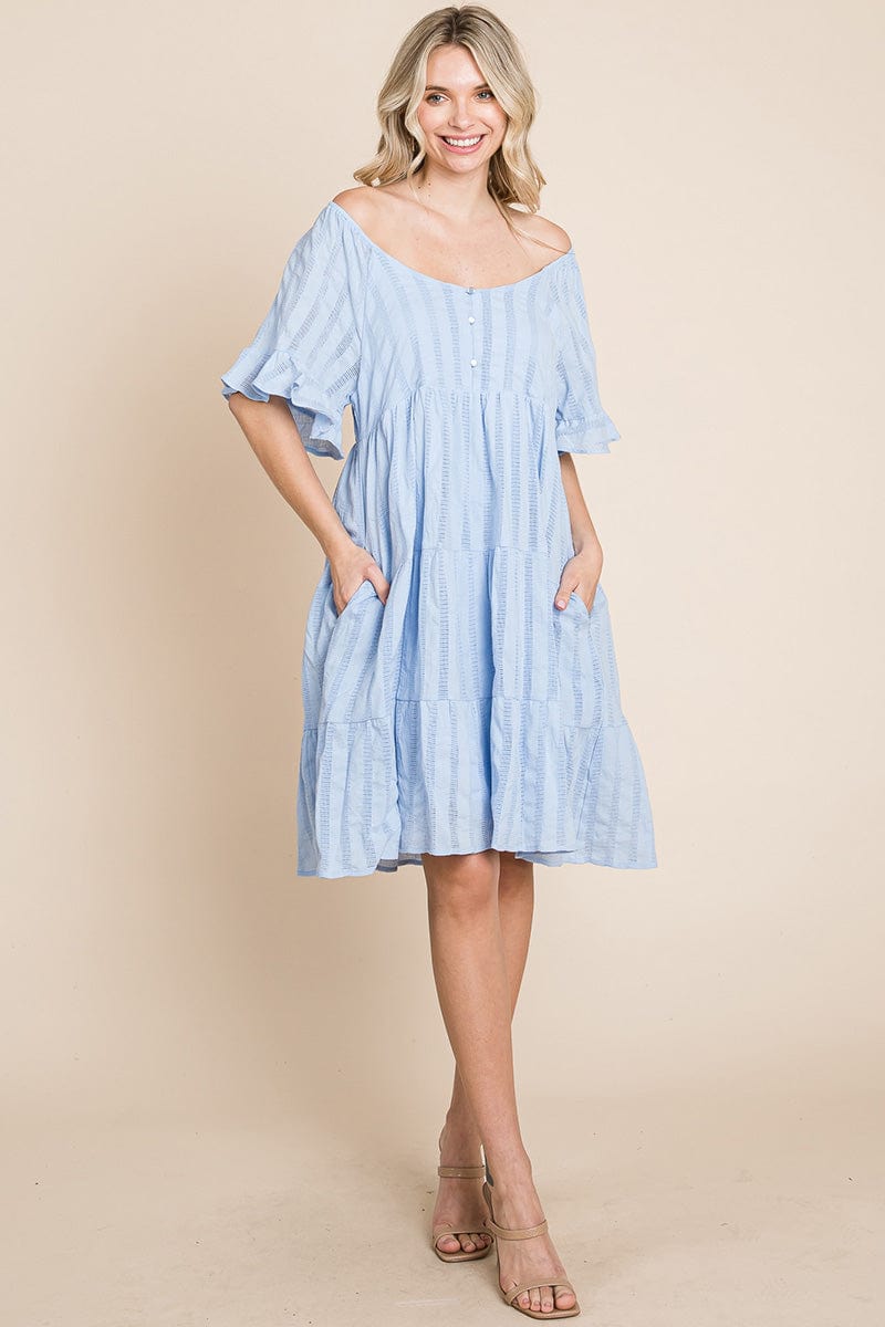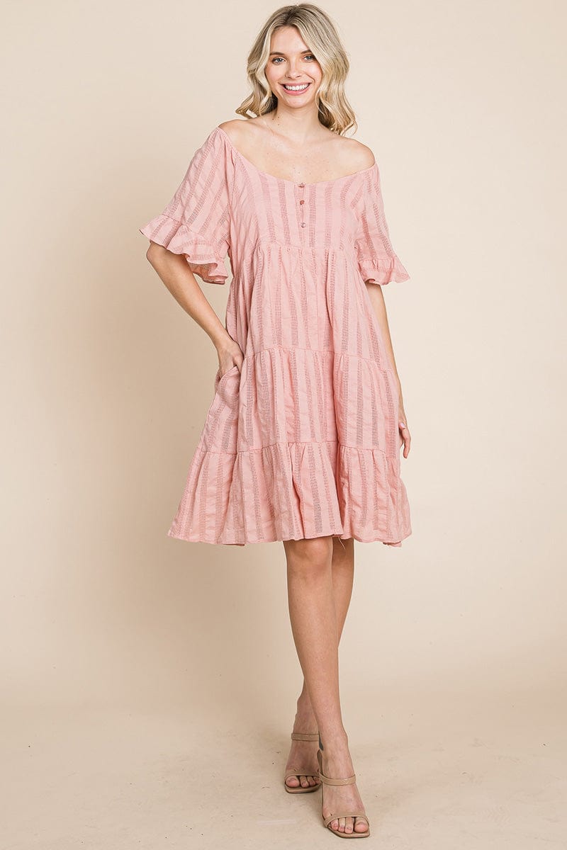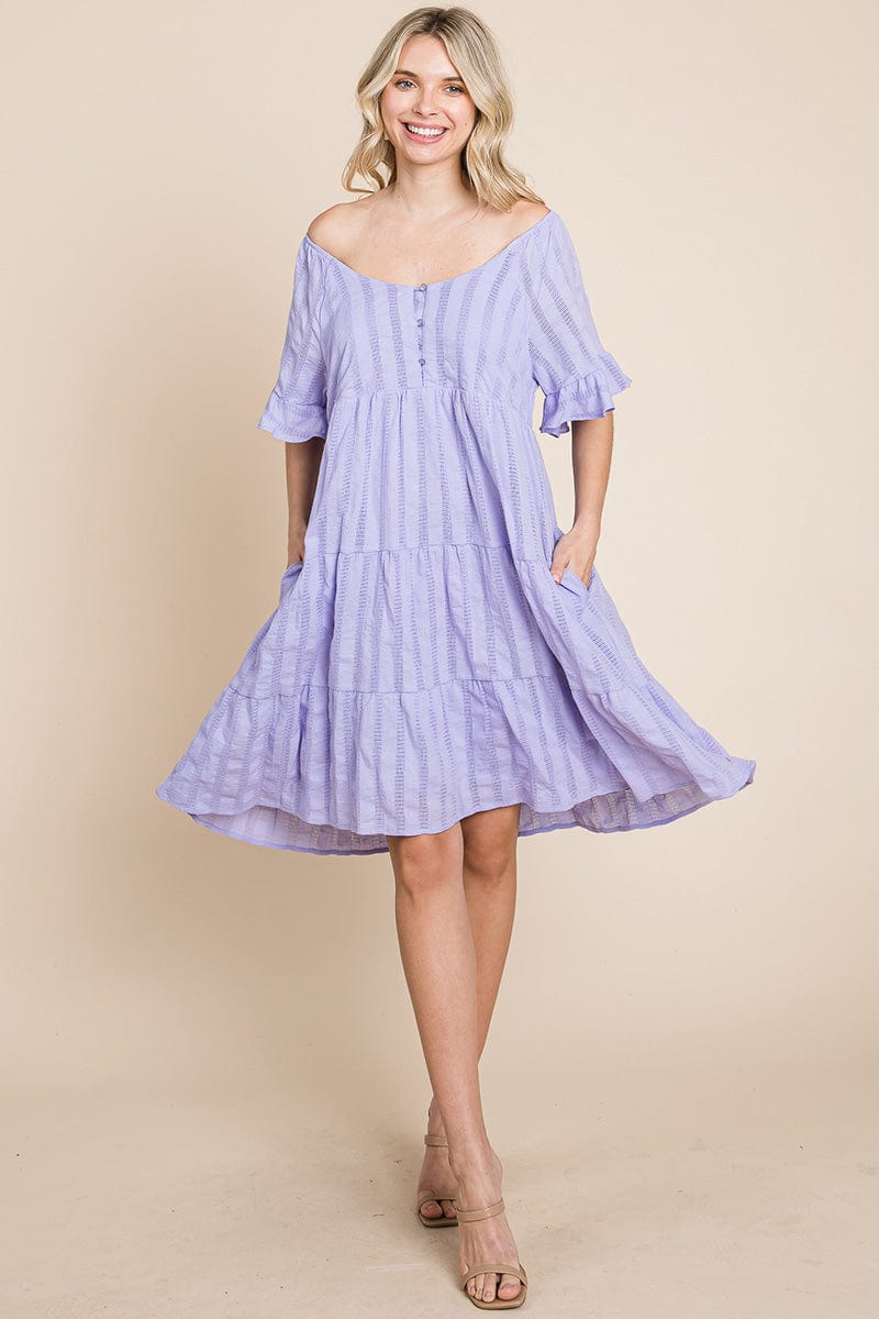 Features: Short Ruffled Sleeve, Boat Neck, Lined, Tiered, Pleated, Knee Length, Button Closure, Striped, Textured, 2 Side Pockets