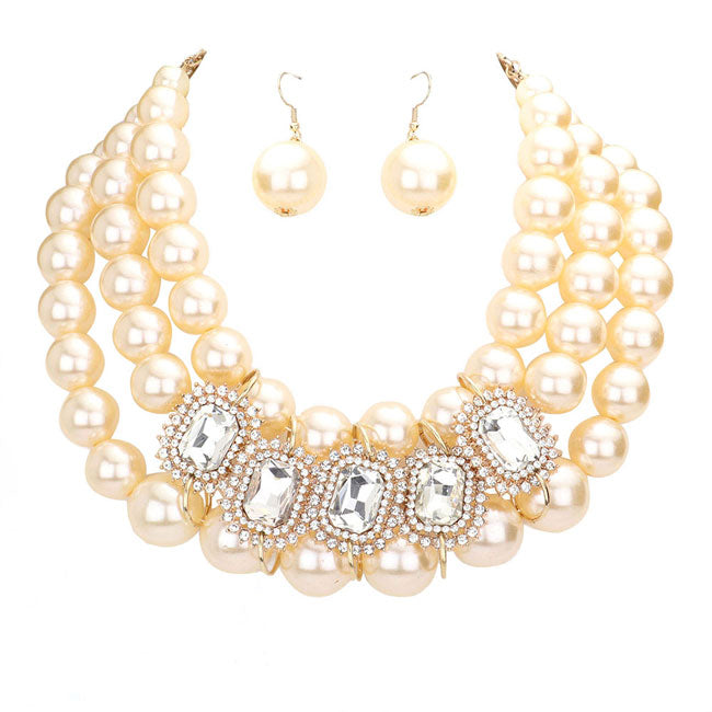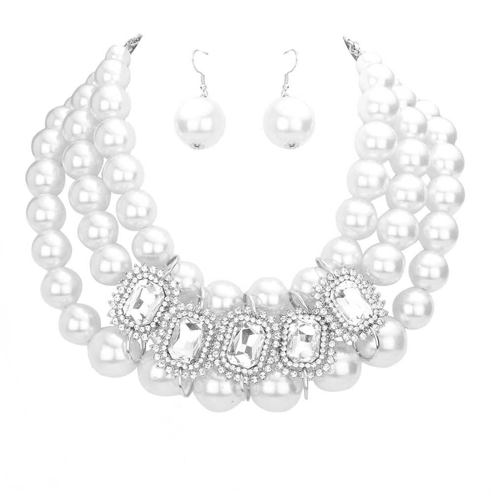 • Rhinestone Pave Stone Accented Pearl Necklace