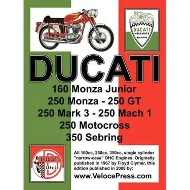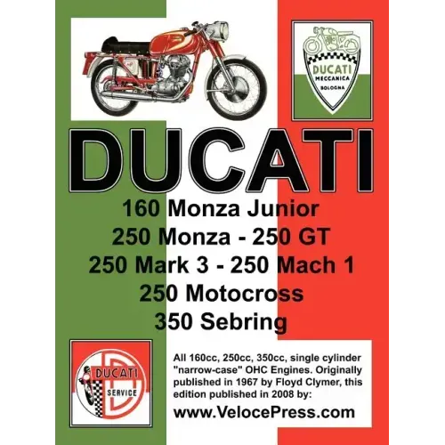A faithful reproduction of the Factory Workshop Manual originally published by Floyd Clymer in 1967. This fully illustrated manual covers the 160cc, 250cc and 350cc narrow case, Single Cylinder, OHC series of Ducati motorcycles including the 160 Monza Junior, 250 Monza, 250GT, 250 Mark 3, 250 Mach1, 250 Motocross and the 350 Sebring. As expected from a factory publication, this manual includes complete technical data and comprehensive detailed instructions for the repair and overhaul of all major and minor mechanical and electrical components, making it an invaluable resource for collectors and restorers of these classic Ducati motorcycles. It contains a comprehensive Technical Specification section for every variant, by year, for each model followed by a descriptive section of all major components. Includes detailed repair and rebuild data for the Engine, Clutch, Transmission, Ducati and Marzocchi Forks, Rear Suspension, Wheels, Brakes and more. It also includes comprehensive information on the Electrical and Ignition Equipment plus Wiring Diagrams. There is adequate detailed text and illustrations to assist in major refurbishing such as an engine rebuild or even a complete mechanical renovation. An essential addition to any Ducati Motor Cycle Enthusiast's library, this book has been out-of-print and unavailable for many years and is becoming increasingly more difficult to find on the secondary market. This is a - must have - reference for this series of Ducati motorcycles and we are pleased to be able to offer this reproduction as a service to all Ducati enthusiasts worldwide.