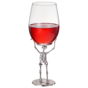 - Terrify and delight your guests when you dress up your next party with the Stemmed Skeleton Wine Glasses that each hold 19 oz of your favorite wine. Your wine will be even more delicious in these spooky glasses. A skeleton is depicted in an elegant form standing tall below your favorite wine in a silver finish. These glasses are designed to spook your guests, your visitors and yourself when you look at them. The skeleton wine glass set is sure to be an eerie addition to any occasion
