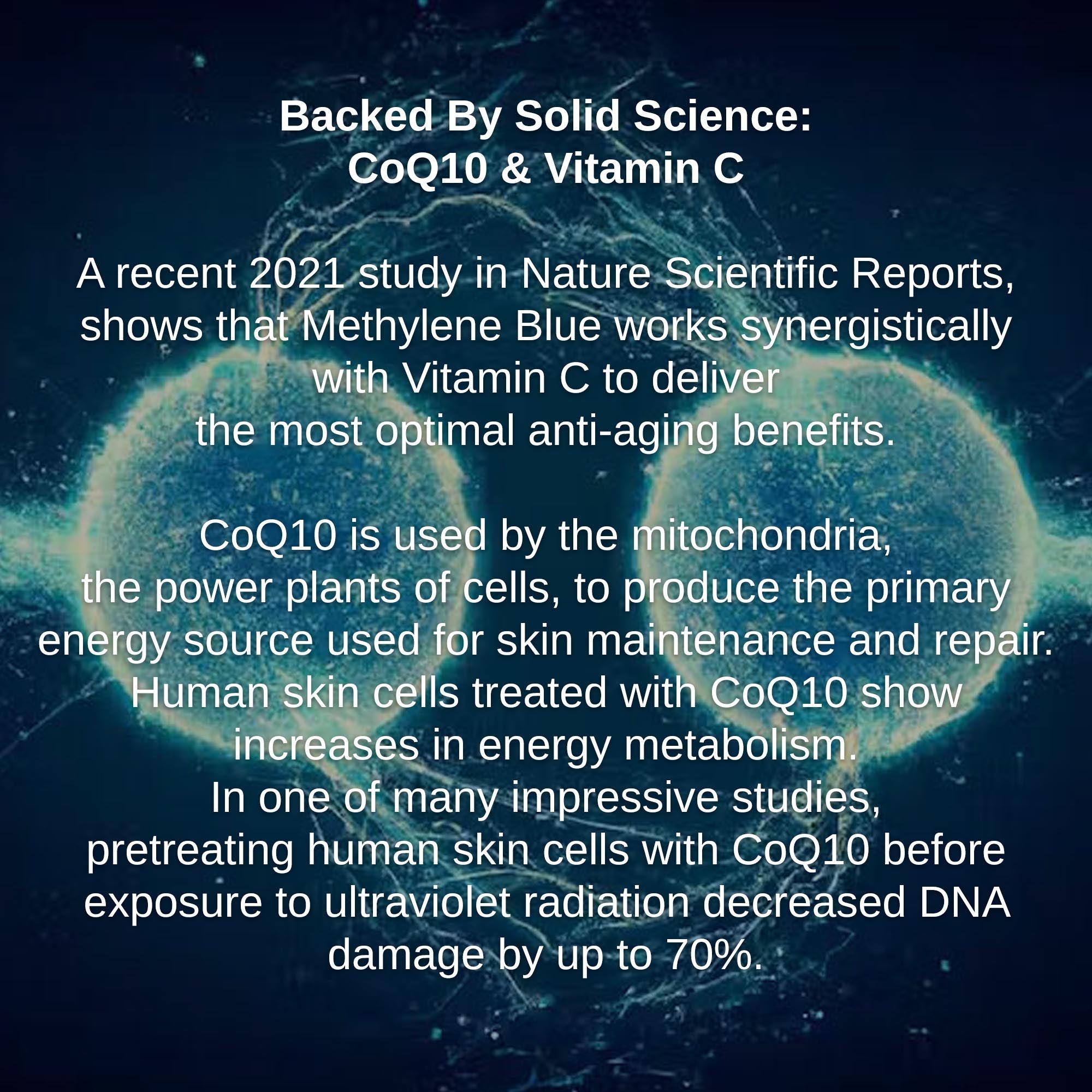 Methylene Blue is one of the most powerful free radical scavengers for humans. Free radicals (inflammation) are the main culprit in skin aging. Methylene Blue is a little bit magical because it can prevent inflammation by neutralizing free radicals and promote healing by donating electrons (energy!) from itself. We have been testing formulations with MB for the last 2 years and it has helped us with many inflammatory issues - including skin issues. It really is a little magical molecule …!