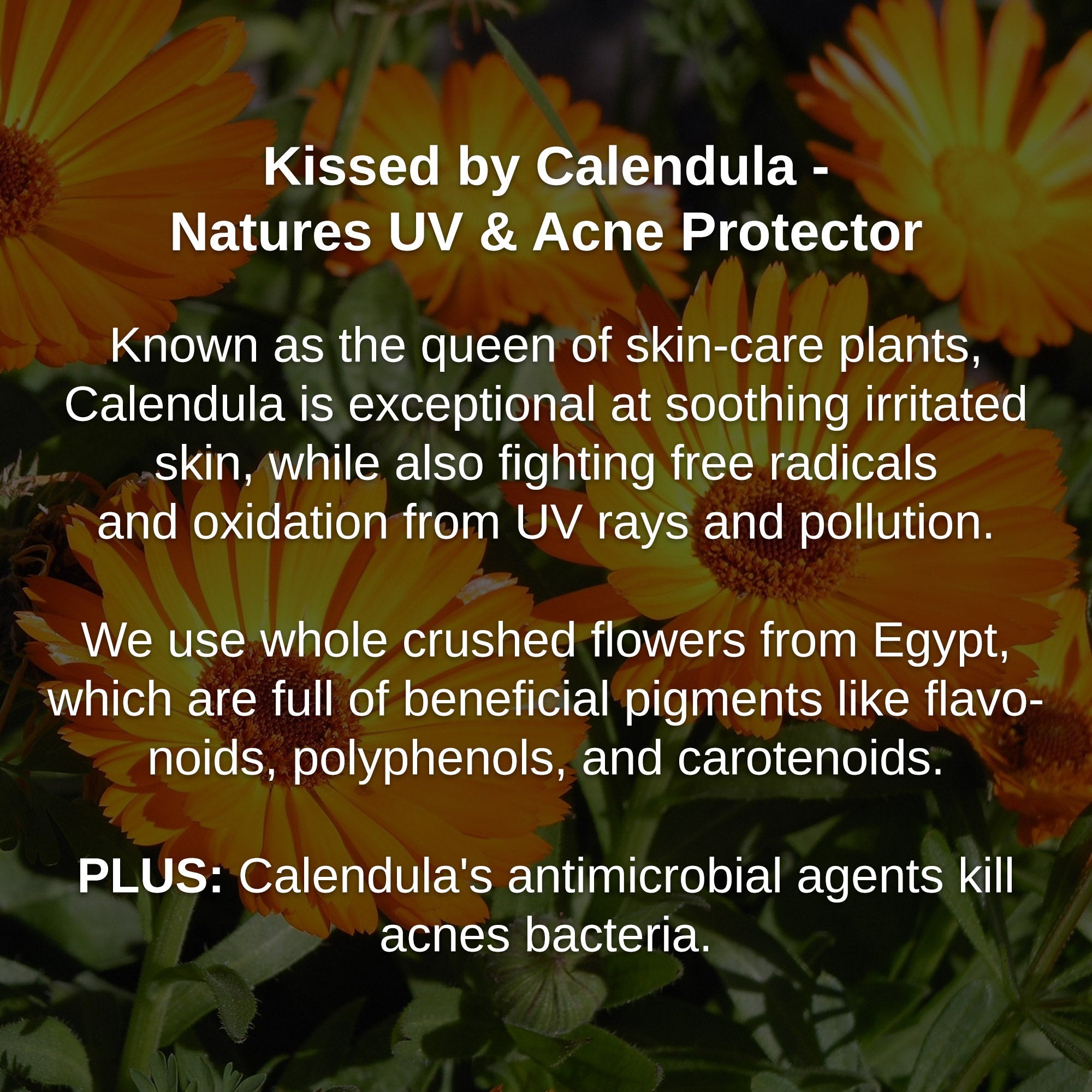- Boosted with UV & Acne protective power from real Calendula flowers.