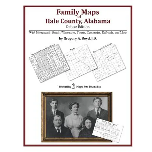 Locating original landowners in maps has never been an easy task-until now. This volume in the Family Maps series contains newly created maps of original landowners (patent maps) in what is now Hale County, Alabama, gleaned from the indexes of the U.S. Bureau of Land Management. But it offers much more than that. For each township in the county, there are two additional maps accompanying the patent map: a road map and a map showing waterways, railroads, and both modern and many historical city-centers and cemeteries. Included are indexes to help you locate what you are looking for, whether you know a person's name, a last name, a place-name, or a cemetery. The combination of maps and indexes are designed to aid researchers of American history or genealogy to explore frontier neighborhoods, examine family migrations, locate hard-to-find cemeteries and towns, as well as locate land based on legal descriptions found in old documents or deeds. The patent-maps are essentially plat maps but instead of depicting owners for a particular year, these maps show original landowners, no matter when the transfer from the federal government was completed. Dates of patents typically begin near the time of statehood and run into the early 1900s. 282 pages with 77 total maps What's Mapped in this book (that you'll not likely find elsewhere) . . . 3946 Parcels of Land (with original landowner names and patent-dates labeled in the relevant map) 110 Cemeteries plus . . . Roads, and existing Rivers, Creeks, Streams, Railroads, and Small-towns (including some historical), etc. What YEARS are these maps for? Here are the counts for parcels of land mapped, by the decade in which the corresponding land patents were issued: DecadeParcel-count 1820s860 1830s2090 1840s133 1850s314 1860s211 1870s18 1880s53 1890s207 1900s28 1910s20 1920s3 1930s2 1940s6 1950s1 What Cities and Towns are in Hale County, Alabama (and in this book)? Akron, Allenville, Arcola, Casemore, Cedarville, Cypress, Darrah, Dominick, East Port Landing, Evansville, Gallion, Gilmore Quarters, Greensboro, Harper Hill, Havana, Hogglesville, Ingram, Lake Bend Landing, Laneville, Lock Five, Melton, Millwood, Moundville, New Prospect, Newbern, Oak Grove, Oak Village, Phipps, Port Royal, Powers, Prairieville, Rosemary, Sawyerville, Stewart, Sunshine, Wateroak, Wedgeworth, Whitsitt