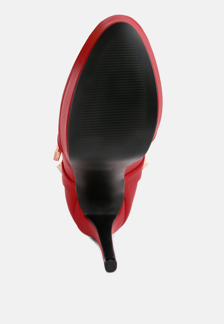 The stud embellished boots are ravishing and bold with a belt embellishment across. The zip opening at the back makes them easy to wear while the lightly padded insole is gentle on the feet. These are great for winter weddings as bridal shoes, wedding guest shoes and party shoes