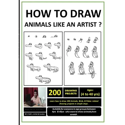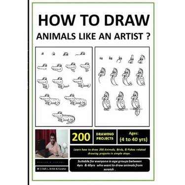 Learn How to Draw 30+ Step by Step Animals, Fish & Birds related Drawing Projects .This Book contains 30+ Step by Step Animals, Fish & Birds Drawing Projects On How to Draw: Owl/Squirrel/Bear./Duck./Rabbit./Dinosaur./Kangaroo./Gorilla/Bunny/Lion/Cock/Hen/Shark/Penguin/Crab./Parrot/Crocodile/Bear/Snail/Sea Horse/Birds/ Dog /Shark/Seal/Goat/Sheep/Cow/Pig/Horse.For Beginners Aspiring to Become Artists & Designers .Learn how to draw animals in simple steps for beginners.