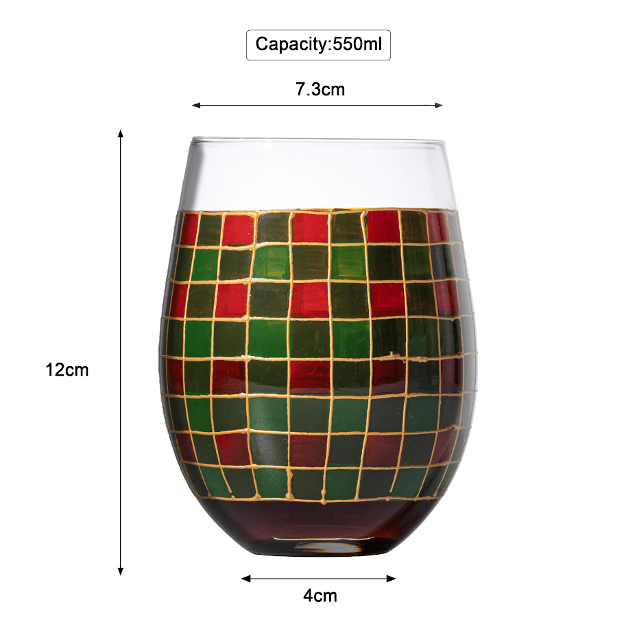 - Ready to drink your way through the Holidays? These stemless 4.7" high wine glasses are specially designed for your enjoyment with two different styles of art to suit almost any décor. With a beautiful and elegant stain-glassed window, these drinking glasses will make every occasion special. The red & green patterns make them the perfect glassware set for Thanksgiving, Christmas, and the winter season! Holds 18.5 oz.