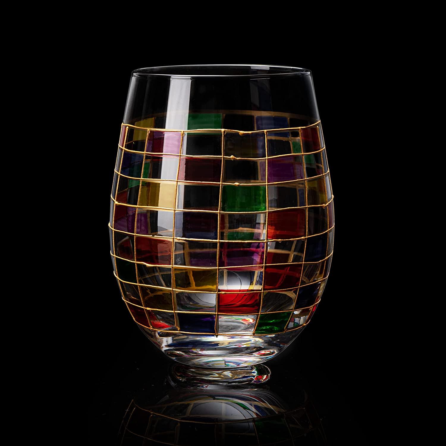 - This set of 2 stemless wine glasses is handcrafted with colored stain-glass in an elegant pattern. The color combinations and design on these glasses make for beautiful tabletop décor and a great conversation starter when entertaining guests. These are perfect for housewarming gifts, birthday gifts, wedding gifts, or any occasion!