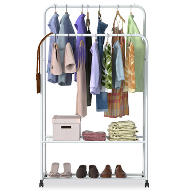 Perfect Closet Organizing System: This garment rack is great for creating storage space to organize your clothes and shoes in your laundry room and bedroom, and even for display in a store or market. Two clothes rails can accommodate double the amount of clothing, and the two-layer rack hold shoes and shoe boxes. Make your room tidy and organized with this rack.