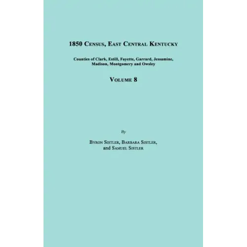 Between 1992 and 1995, Barbara, Byron and Samuel Sistler transcribed the 1850 United States Census Schedules for Kentucky, in the original order, providing the names and ages of all individuals, followed by a single head-of-household index for the region covered by each volume. There are 14 volumes in the set, covering the entire state of Kentucky. This work, Volume 8, the regional volume of South West Kentucky, covers Clark, Estill, Fayette, Garrard, Jessamine, Madison, Montgomery and Owsley Counties, and includes approximately 68,000 names. Paperback, (1995), repr. 2012, Index, 544 pp.