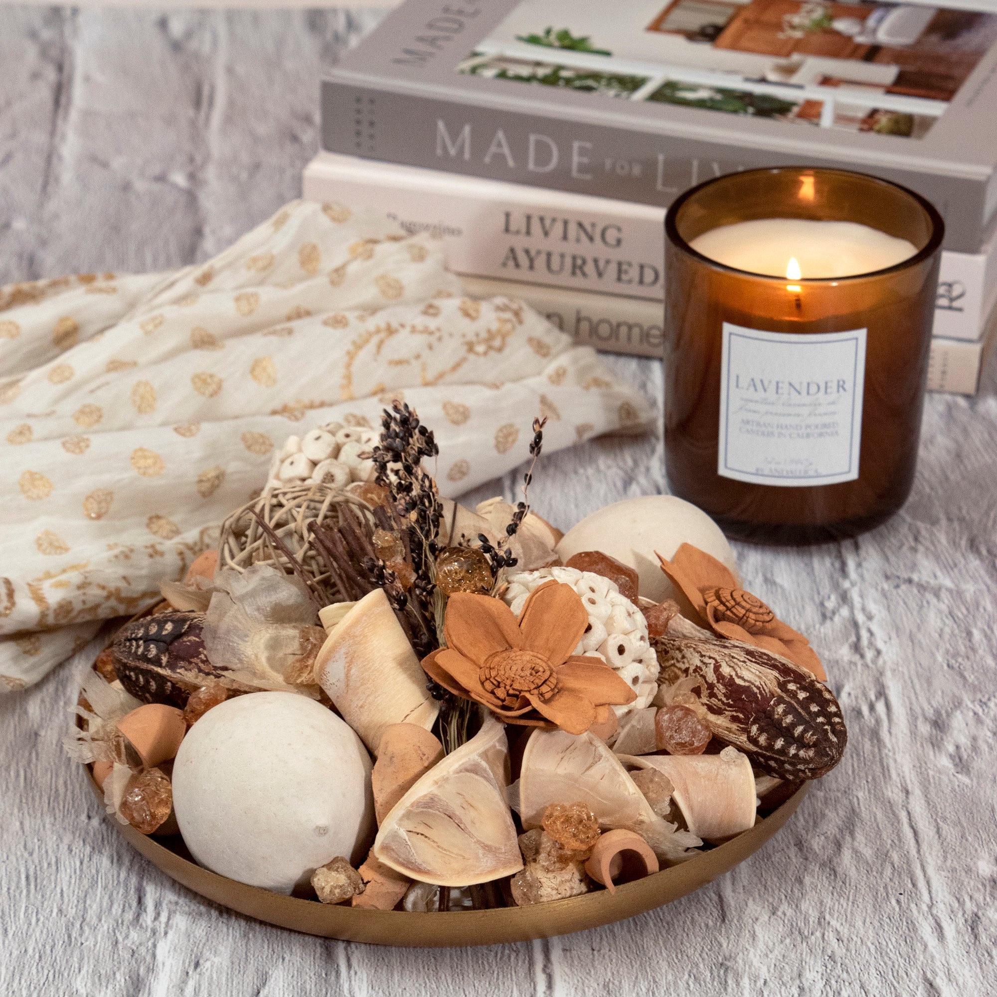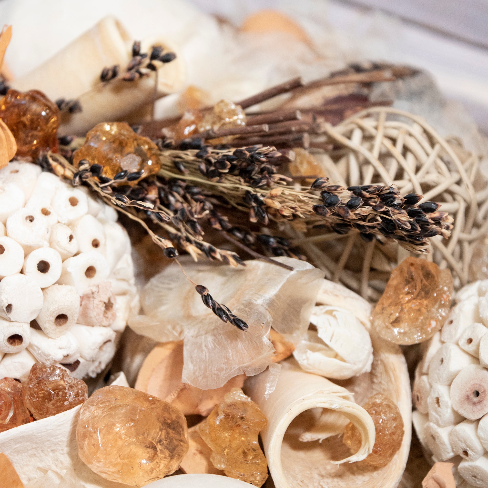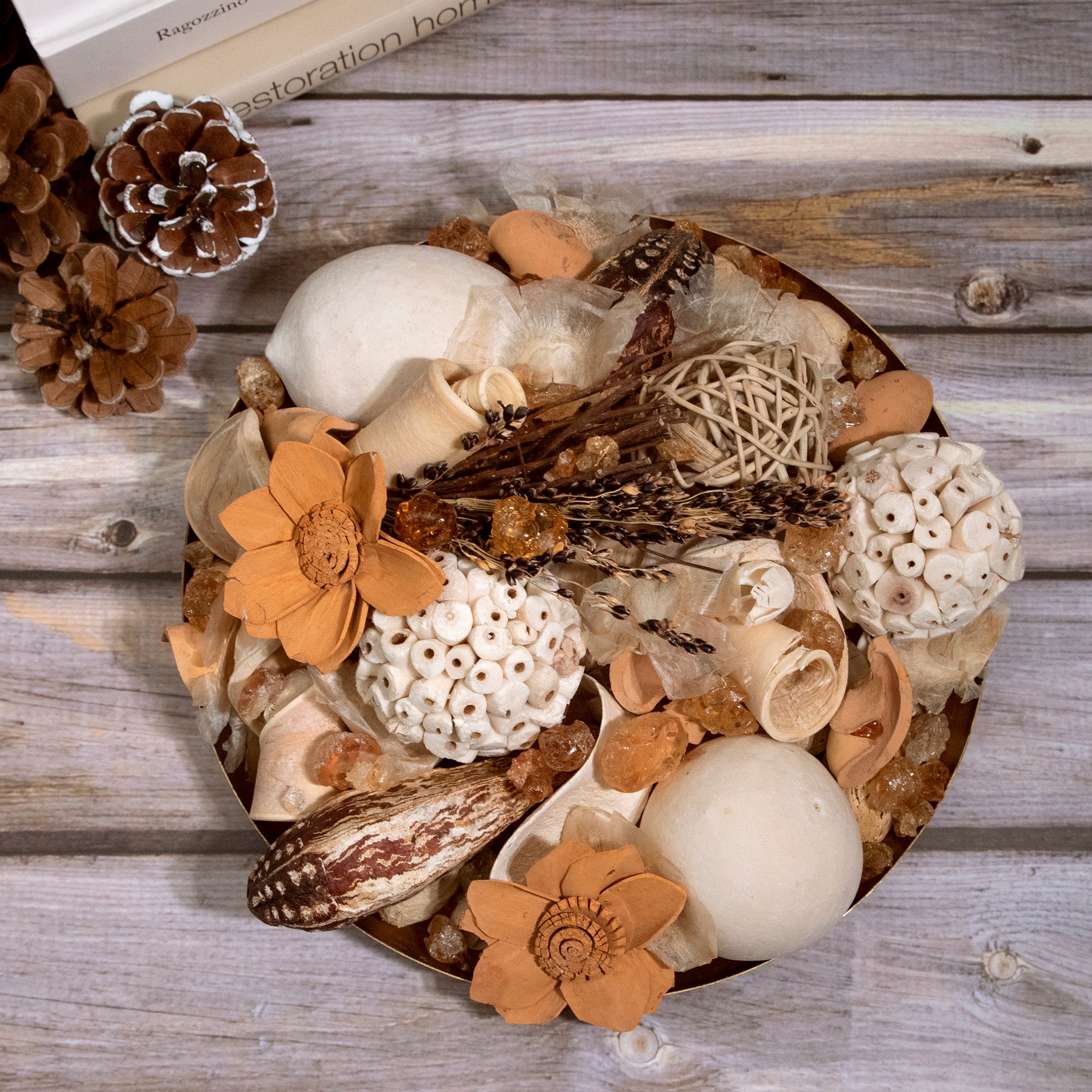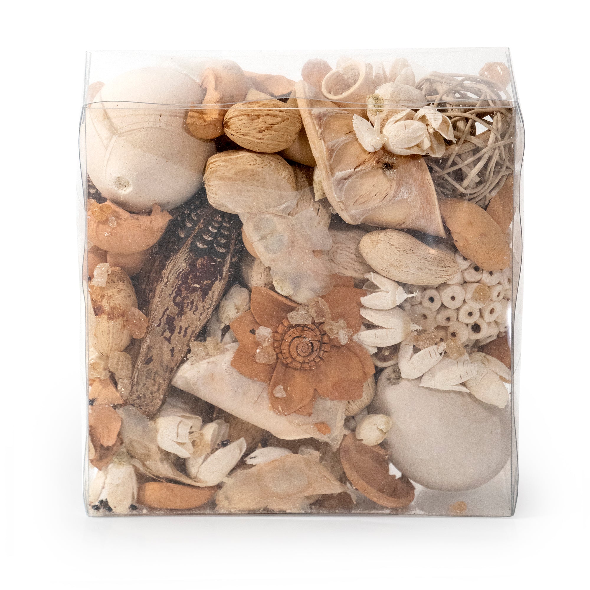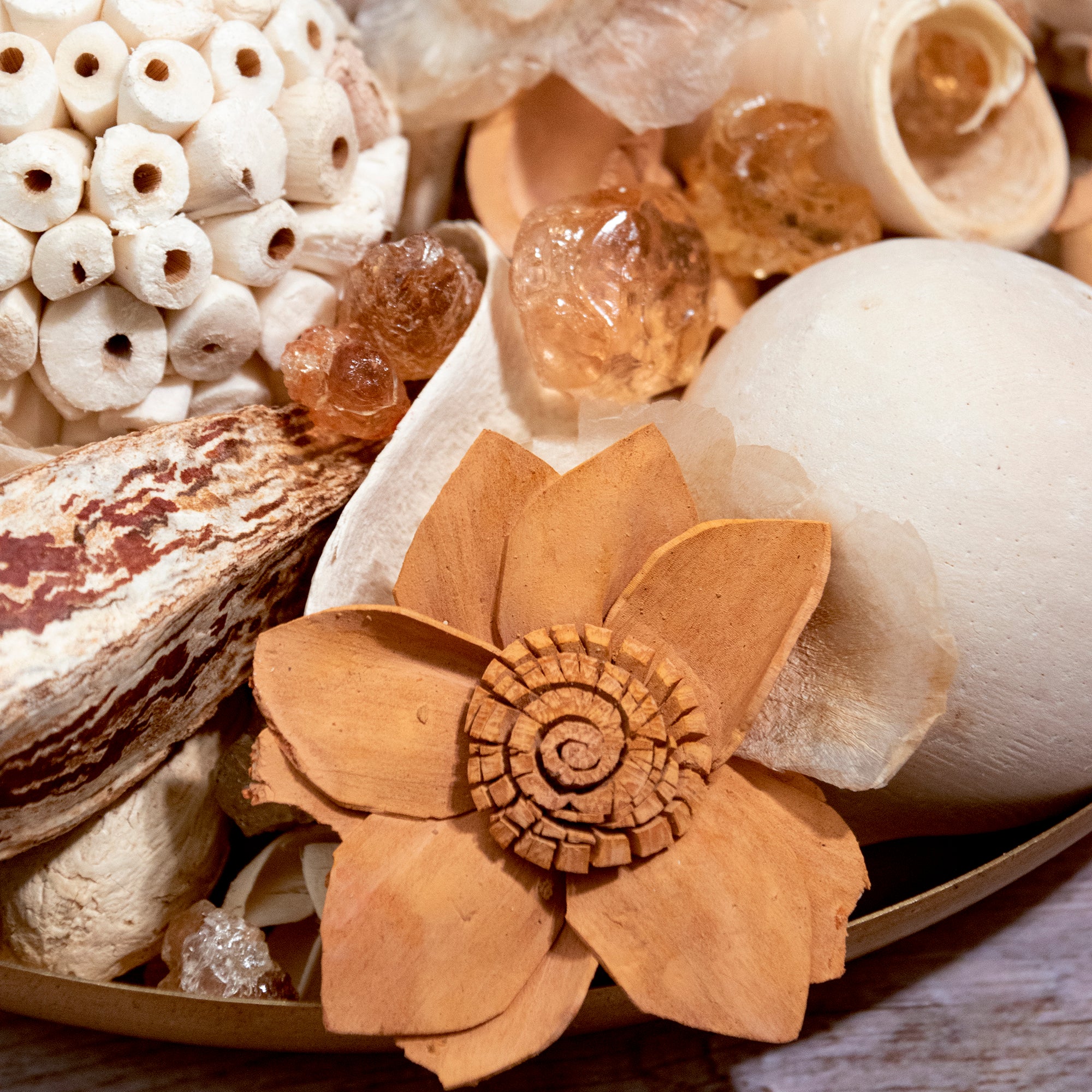 Simple, natural textures and neutral colors enable this potpourri to easily accentuate any home. With a fragrance simple yet complex this is sure to be a favorite potpourri.Always handcrafted in California.