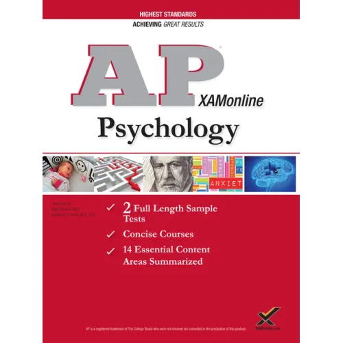 XAMonline's AP Psychology is focused on the quality of the two sample tests and a full detailed review of essential information of content review. When there is so much to know you need a no-fluff approach that is standards based. The true to format sample tests are unique to the individual test. The quality of information presented often uses tables and charts so you do not have to wade through a wordy guide and can get right to the point with the most efficiency.