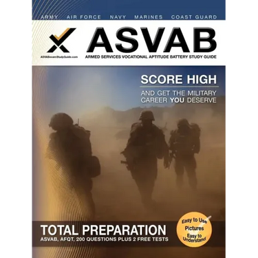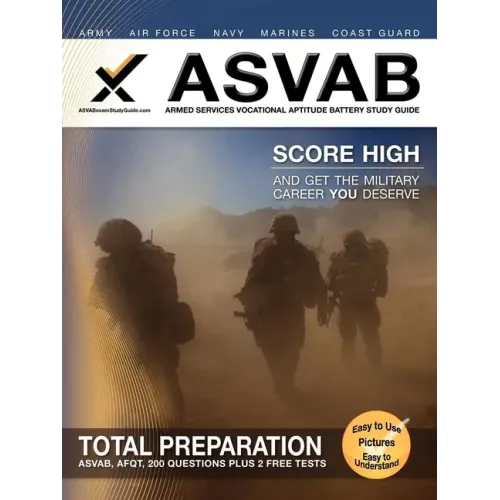 ASVAB Armed Services Vocational Aptitude Battery Study Guide covers the ten content categories from the ASVAB exam: Word Knowledge, Paragraph Comprehension, Arithmetic Reasoning, Mathematics Knowledge, General Science, Mechanical Comprehension, Electronics Information, Shop Information, Automotive Information, and Assembling Objects.