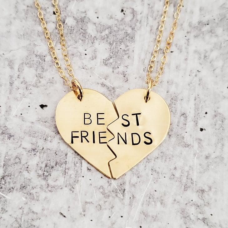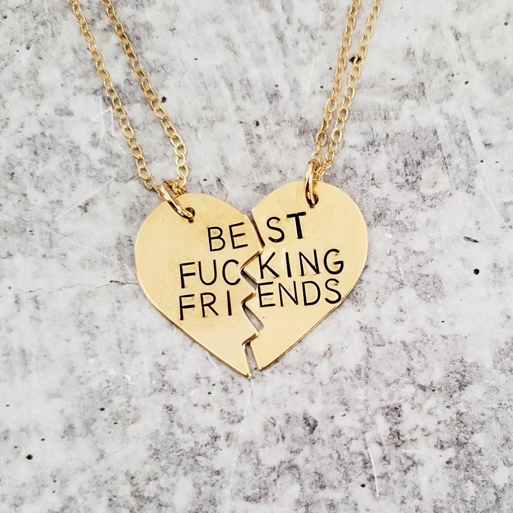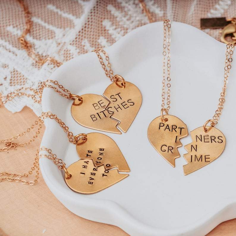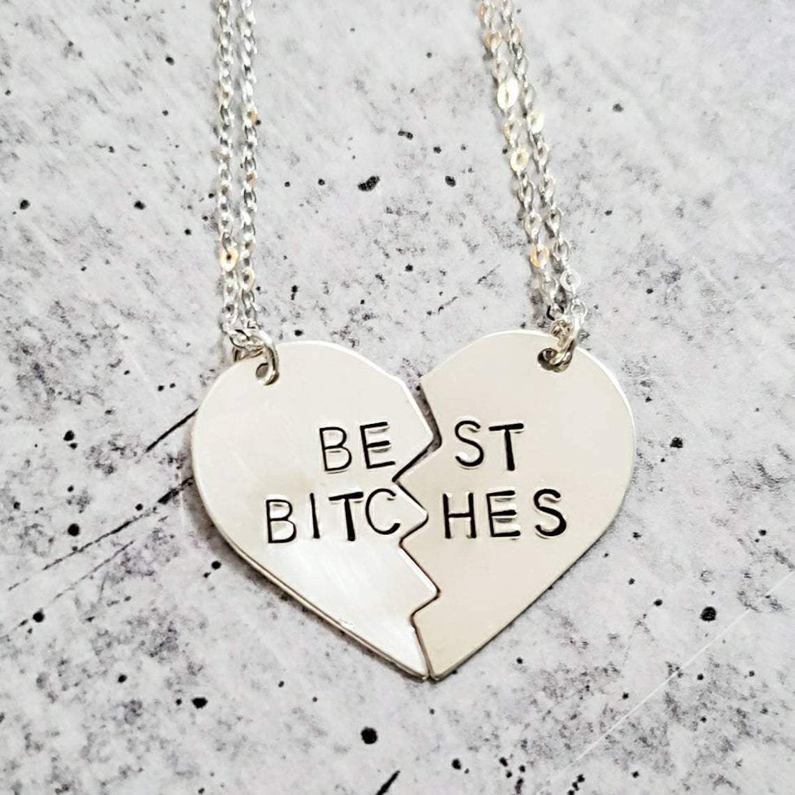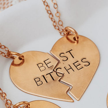 These TWO beautiful broken heart necklaces are hand-stamped as one with the phrase of your choice — “BEST BITCHES”, "BEST FRIENDS", or "BEST FUCKING FRIENDS" — in uppercase block letters. When the necklaces are apart, the message on the full necklace isn't clear, which is great for those of us who love to laugh at ourselves!
