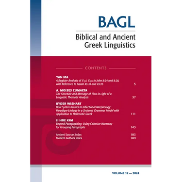 Biblical and Ancient Greek Linguistics (BAGL) is an international journal that exists to further the application of modern linguistics to the study of Ancient and Biblical Greek, with a particular focus on the analysis of texts, including but not restricted to the Greek New Testament. The journal is hosted by McMaster Divinity College and works in conjunction with its Centre for Biblical Linguistics, Translation and Exegesis, and the OpenText.org organization (www.opentext.org) in the sponsoring of conferences and symposia open to scholars and students working in Greek linguistics who are interested in contributing to advancing the discussion and methods of the field of research. BAGL is a refereed on-line and print journal dedicated to distributing the results of significant research in the area of linguistic theory and application to biblical and ancient Greek, and is open to all scholars, not just those connected to the Centre and the OpenText.org project.