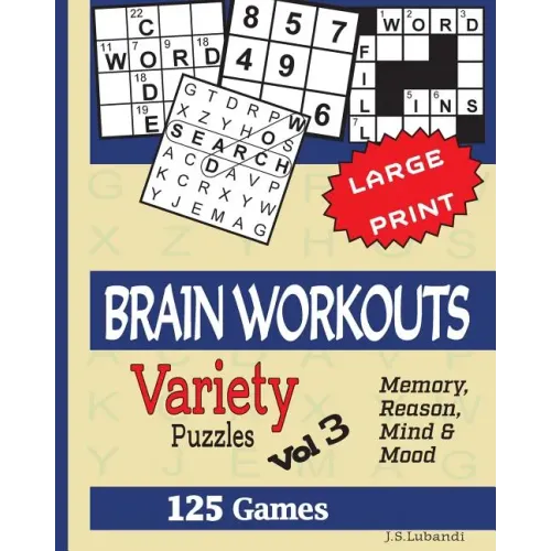 Welcome to the new BRAIN WORKOUTS (Variety) Puzzles Vol 3, a collection of 125 fantastic puzzles developed to help people boost their memory, reasoning, creative thinking and problem solving. They also relax the mind and relieve stress.Solving the puzzles in this book can provide vigorous mental workouts for everyone from youngsters to senior citizens. All puzzles in this book have been designed in large print with high contrast, which makes them perfect for all ages, including the visually impaired. Answers are well arranged at the back of the book just in case you're stuck on the way! Puzzles are just pure fun!