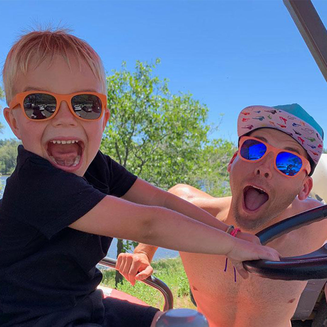 If you (or your family) are a fan of the YouTube star Blippi, then these bright orange glasses are just for you! Now you can match your little one in our adult bright orange sunglasses. All Roshambo frames are proudly made in Italy and assembled in the United States. They are BPA, phthalate, lead & latex free, and small parts tested as safe for babies. Plus, they are virtually unbreakable...we offer a full damage replacement guarantee if they get broken!