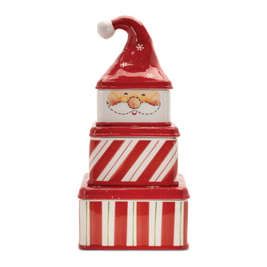 Add a touch of whimsical holiday charm to your decor with this Ceramic Stacking Santa Canister Set. Featuring a jolly Santa design on the smallest canister and a festive red and white finish with a glossy glaze, these canisters stack perfectly from largest to smallest for a playful, eye-catching display. Functional as well as decorative, use them to store holiday sweets or treats, or entertain guests with these adorable pieces that will bring joy to any Christmas gathering. Sold in a set of three assorted sizes.