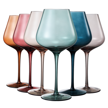 - The muted colored wine glass set is the perfect addition to your glassware collection. Sold as a set of 6, the glasses come in a variety of muted colors, including red, blue, tan, grey, green, and orange. These subtle tones give the glasses an elegant and sophisticated look that is perfect for any occasion.