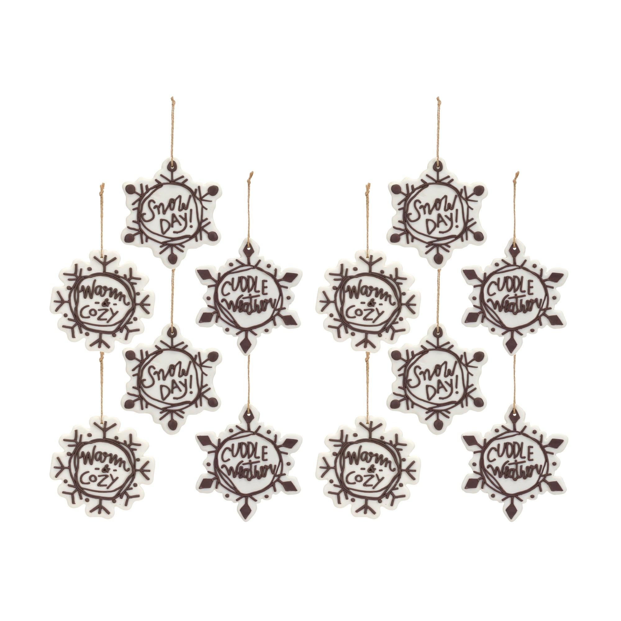 Add a touch of whimsy and warmth to your holiday celebrations with this Cut Cookie Design Snowflake Ornament Set. Crafted in a rustic white and brown finish, these charming snowflakes feature cozy holiday sentiments like "Snow Day!", "Warm & Cozy", and "Cuddle Weather." This 12-piece set (with three different sizes) brings a festive, handcrafted touch to your Christmas tree or makes an excellent gift for friends and family. Durable and easy to hang, these ornaments will be cherished for years to come!