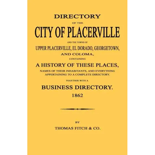 This 1862 book covers a major portion of El Dorado County, California, a significant mining location during the gold rush of 1849. Specifically addressed are the towns of Placerville, Upper Placerville, El Dorado, Georgetown, and Coloma, as well as a Business Directory. The book, originally published in 1862, is a directory of both inhabitants and businesses, containing names, occupations and, sometimes, locations; histories; advertising; churches; government officials and more. It is an excellent resource for anyone researching California during the gold rush. Paperback, (1862), repr. 2011, Illus., Index, 128 pp.