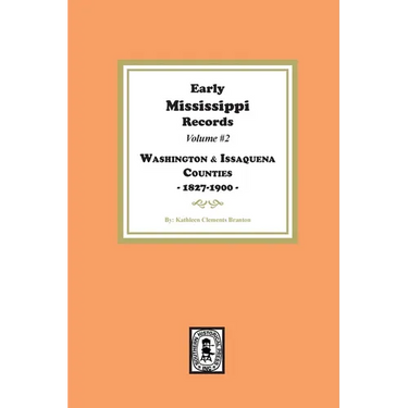 By: Katherine Branton, Pub. 1983, reprinted 2024, 200 pages, Index, soft cover, ISBN #978-1-63914-324-5. Washington County was formed in 1827 from Warren and Yazoo Counties. Issaquena County was created from Washington County in 1844. Records for Washington County within this book are: Original Patents 1829-1840, Marriage Records from Circuit Court records 1854-1871, Marriage Records from The Greenville Times 1874-1889, Death Notices from The Greenville Times 1868-1889, Deaths from the Yellow Fever Epidemic 1878, Will Book 1 continued from Volume #1: 1880-1894, Abstracts of 70 Packet Gleanings from 1827-1868 which contains data on Wills, Estates, Intestates, Guardianships, marriages, deaths, children, and etc.... Records for Issaquena County Within this book are: Index to Will Book "A" 1846-1853, Index to Estate Packets, Abstracts of 210 Packet Gleaming 1840-1900 which contains data on Wills, Estates, Intestates, Guardianships, marriages, deaths, children, and etc.... The Index mentions Approximately 6,000 persons.