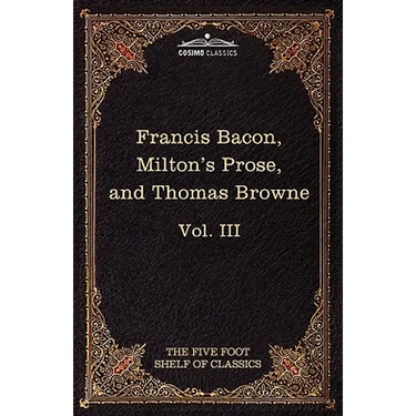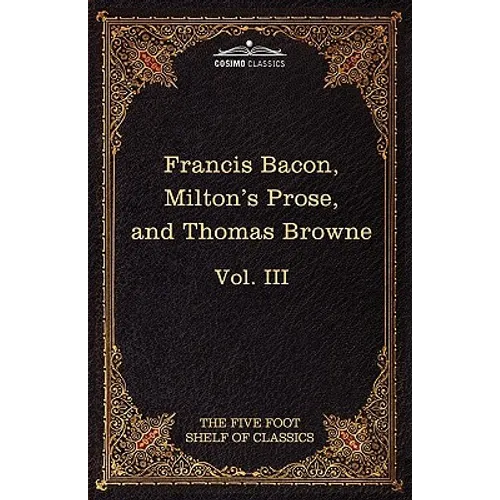 Author name not noted above: Sir Thomas Browne. Originally published between 1909 and 1917 under the name "Harvard Classics," this stupendous 51-volume set-a collection of the greatest writings from literature, philosophy, history, and mythology-was assembled by American academic CHARLES WILLIAM ELIOT (1834-1926), Harvard University's longest-serving president. Also known as "Dr. Eliot's Five Foot Shelf," it represented Eliot's belief that a basic liberal education could be gleaned by reading from an anthology of works that could fit on five feet of bookshelf. Volume III features: - Essays or Counsels--Civil and Moral and The New Atlantis, by English scientist and philosopher SIR FRANCIS BACON (1561-1626), the former the foundational writings of his development of the scientific method, and the latter his utopian novel that influenced British notions of science as a noble endeavor. - Areopagitica and Tractate on Education, by English poet JOHN MILTON (1608-1674), respectively his tract against censorship and his ideas on educational reform; both helped modernize English society. - Religio Medici, by English polymath SIR THOMAS BROWNE (1605-1682), one of the earliest personal memoirs that, as a psychological self-evaluation, would later influence Jung.