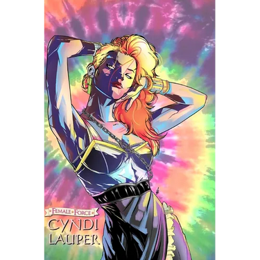 Cyndi Lauper who is a "Female Force"! The new biography comic book unveils her dynamic journey across realms. A pop sensation transcends dimensions, igniting change and harmony, while her music echoes across diverse worlds.