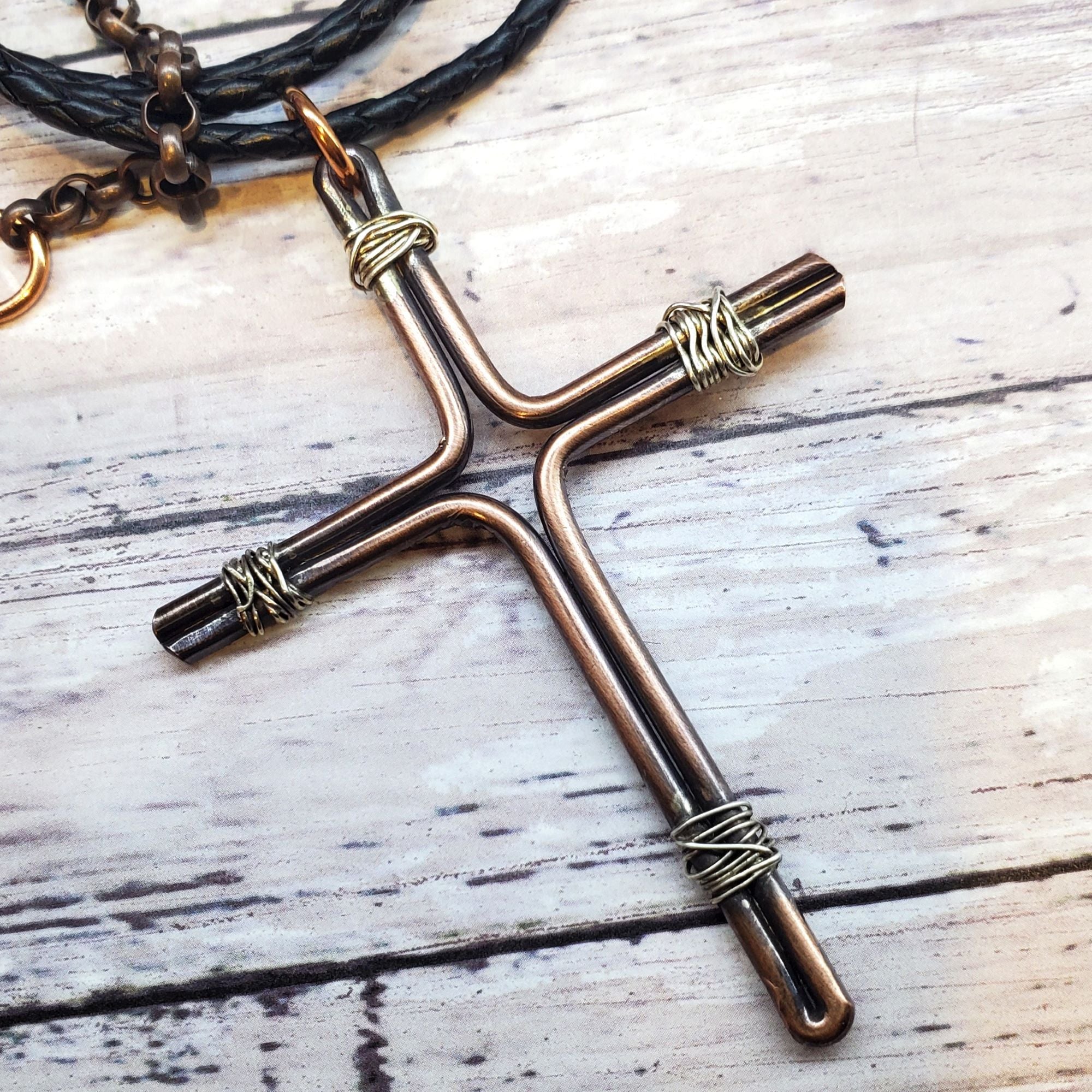 This stunning handmade copper and silver wire cross necklace is perfect for men. Crafted with care and precision, it showcases the beauty of both metals. Its unique design is eye-catching and adds a touch of elegance to any outfit. A must-have for those who appreciate high-quality, one-of-a-kind jewelry. This handsome, large 10 gauge copper wire cross pendant is handcrafted with a unique look. Sterling silver wire is carefully wrapped and soldered to the crossbars. The cross is then tumbled to a high shine, matted in parts and antiqued for a rustic finish. Every cross is one-of-a-kind - just take a look at the individual pictures for proof!