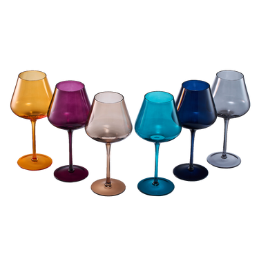 - Sold as a set of 6, the glasses come in a variety of colors inspired by the autumn season. (1) butterscotch, (1) teal, (1) amethyst, (1) amber smoke, (1) rose, & (1) midnight blue. With a capacity of 20 ounces, they are ideal for serving wine, as well as other beverages. Whether you are hosting a small gathering or a large celebration, the spring colored wine glass set is the perfect choice.