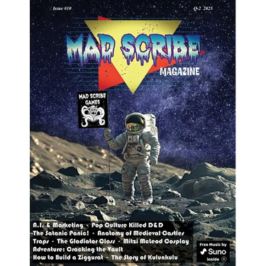This is the 10th issue of Mad Scribe Magazine and the second issue of 2025. Mad Scribe Magazine is a quarterly tabletop gaming publication. In issue #10, we contemplate the fact that "everything old is new" as we touch on several retro topics that have recently resurfaced in the tabletop hobby. This issue features articles on pop culture's effects on D&D; we look back at the "Satanic Panic," the role of AI in marketing, the anatomy of medieval castles, historical traps, the true role of gladiators, and how they can be incorporated into your game, a step-by-step instructional article on how to build a Ziggurat, and we take a look at Mitzi McLeod Cosplay. Enjoy!