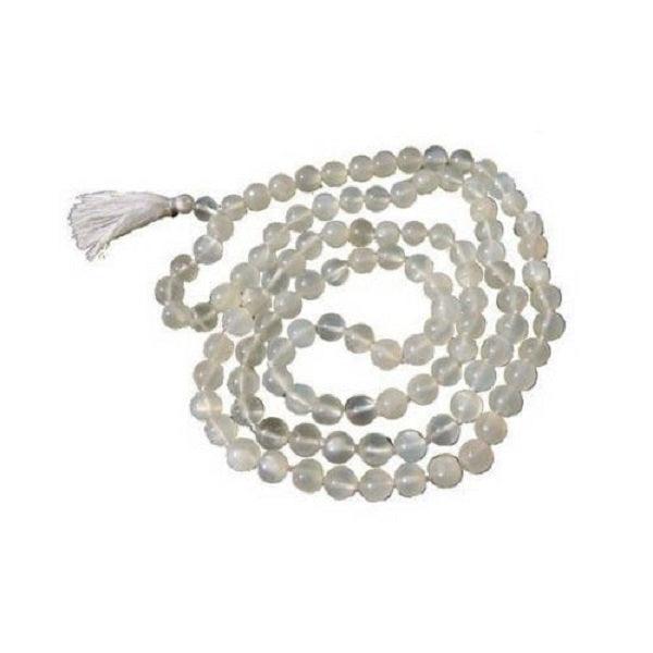 This mala, made from the gem moonstone, carries a peaceful air as the light plays with the white marbled beads.