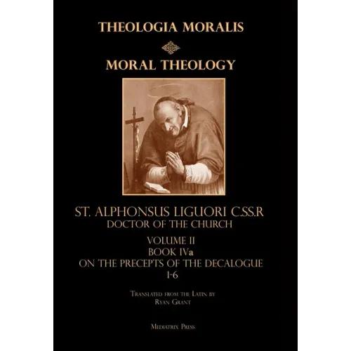 St. Alphonsus Liguori's Moral Theology has long been praised and held in the highest regard by the Church, covering every moral question of his day. This first ever English translation features book 4 of the Theologia Moralis, on The First through Sixth Commandments. These will cover topics as broad as the sin of divination, worshiping demons, blasphemy, oaths, vows, and when they are binding; when you must go to Mass and abstain from work, as well as considerations on the fourth commandment in regard to obedience, the fifth in terms of murder, just war and abortion, and in the 6th, adultery and the various sins against chastity.