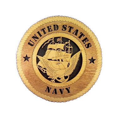 Our artist will cut each piece from imported Baltic Birch trees, then stain the plaque an Early American hue. The black background forces the completed piece into full view, raising the crest of the United States Navy to full prominence. Each level is layered, so the observer is looking through the cut out design of this intricately made piece.