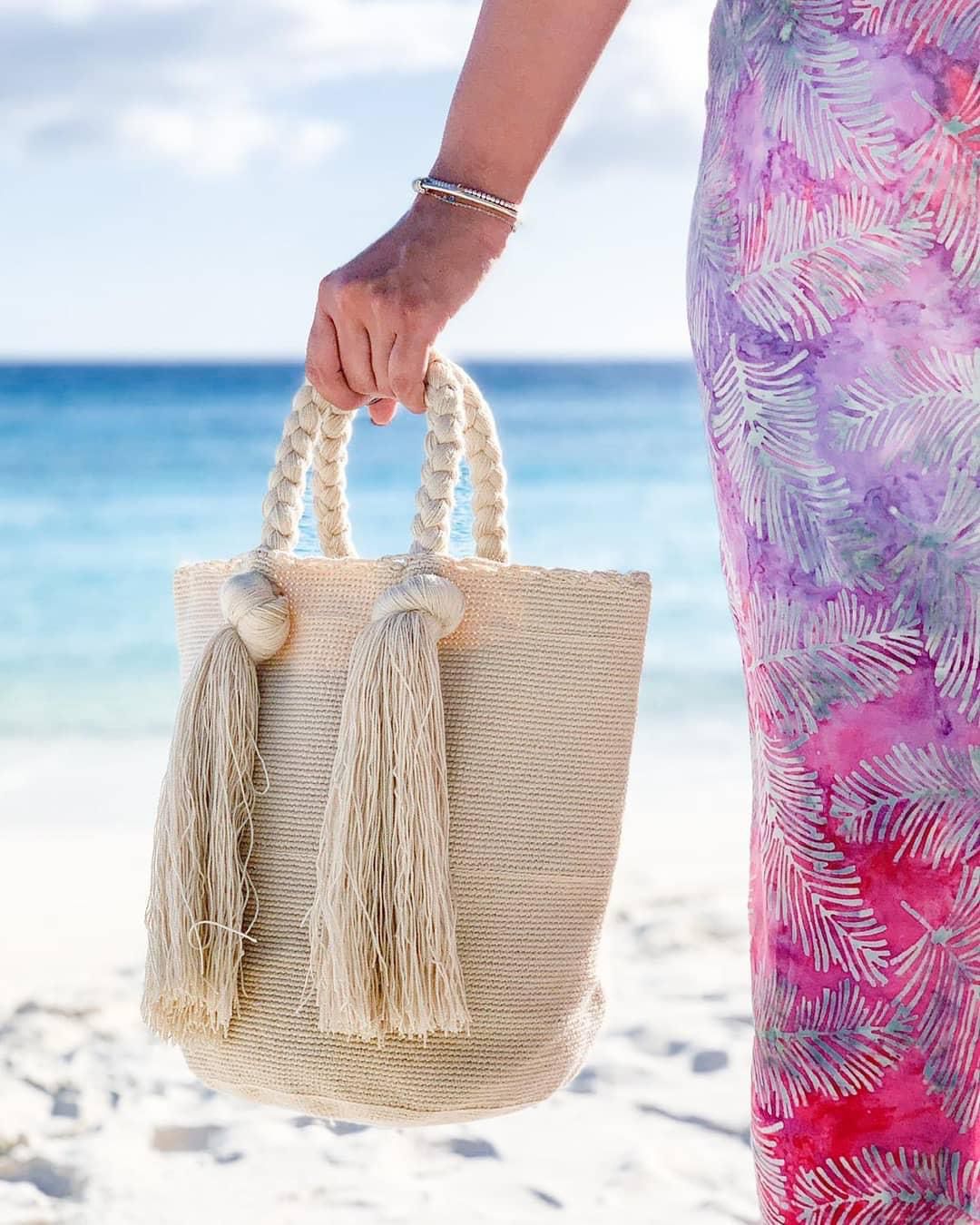 Imported from the Wayuu tribe in Colombia, where generations of women are weaving their centuries of experience into hues of colored mochilas. The ancestral woven technique used guarantees that the bag and strand will not lose their shape with use. Will last you for years.Fabric: