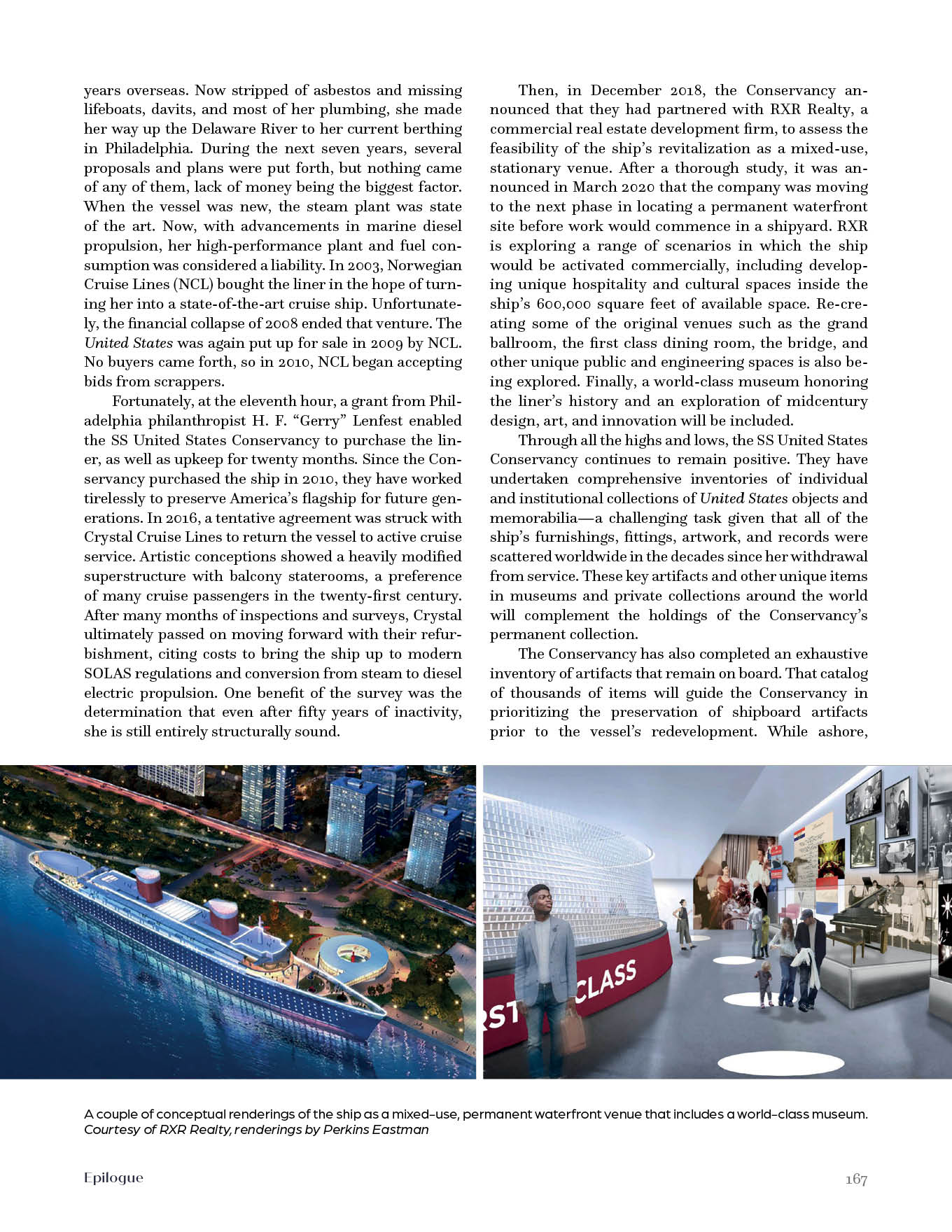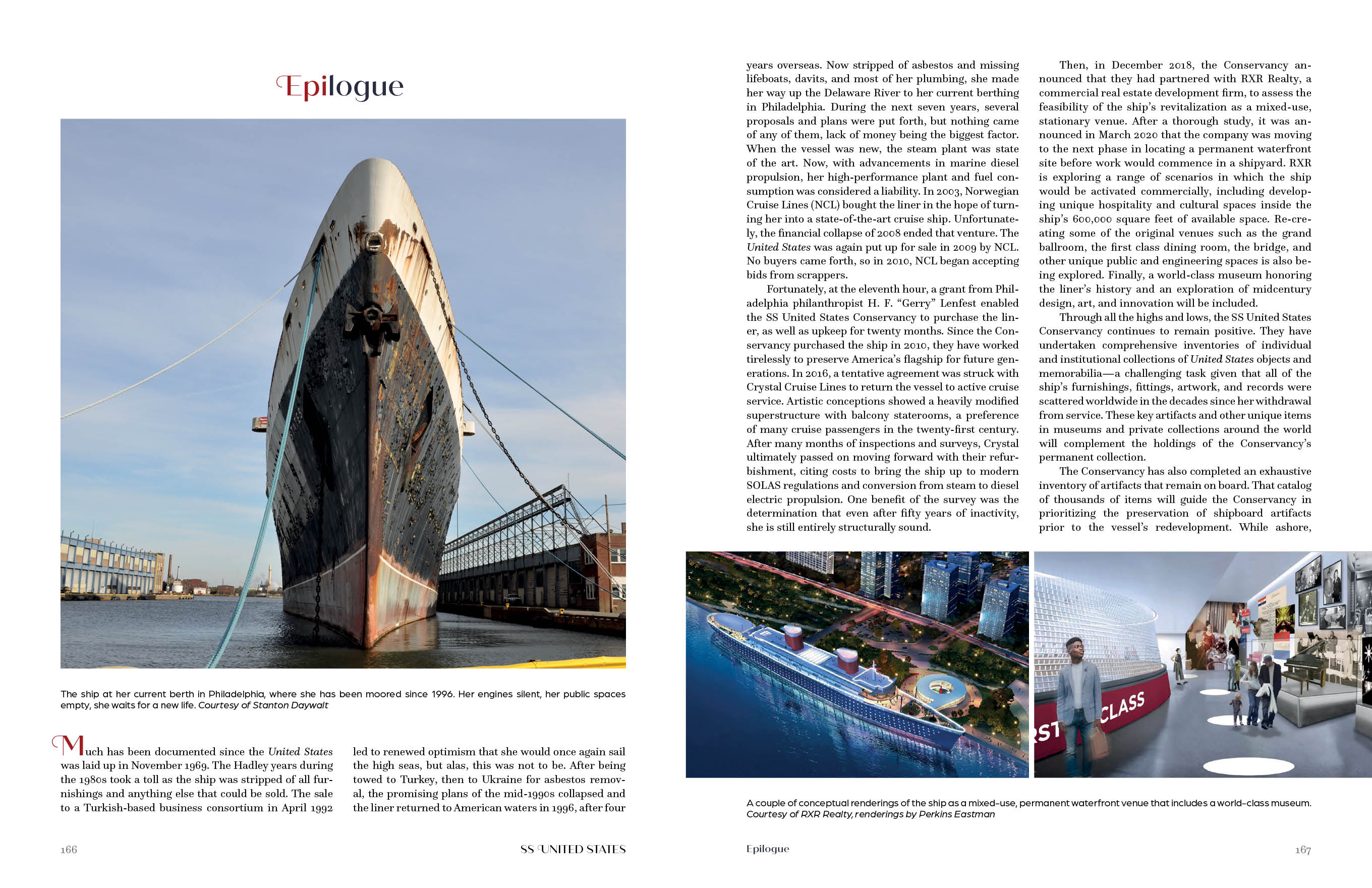 Currently docked in Philadelphia, the SS United States Conservancy, headed by Susan Gibbs, the granddaughter of William Francis Gibbs, is spearheading efforts for its revitalization.