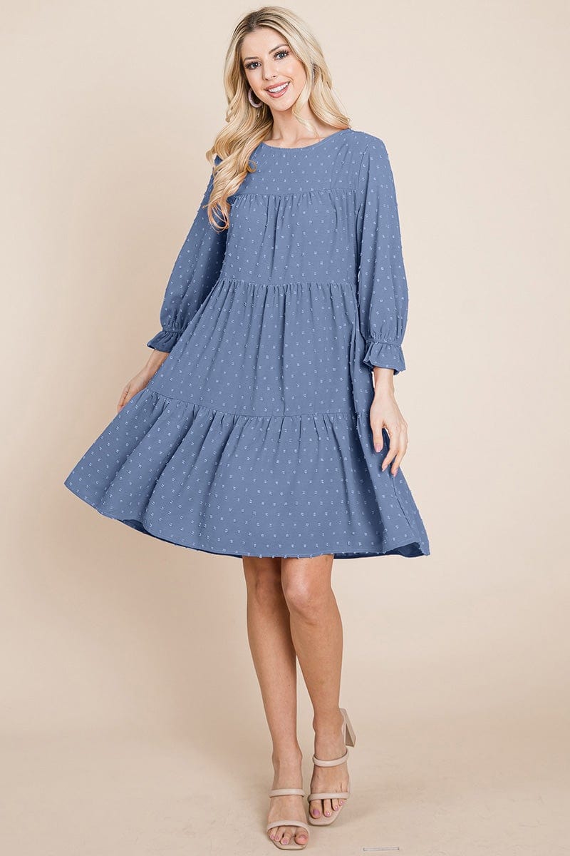 Features: Long Sleeve, Dotted Swiss Fabric, Back Keyhole closure, 3 layered dress, Polka dot, above the knee length, Ruffle Flowy Dress, Loose fit, Round neck