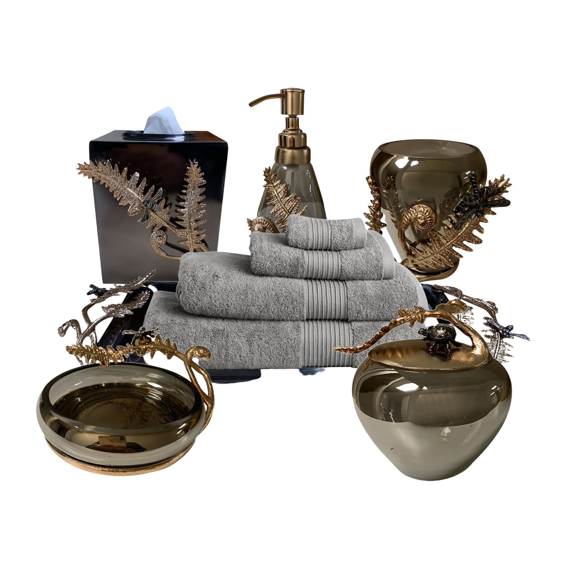 Add a glamorous touch of elegant style to your bathroom with this dazzling The Fern Collection bath accessories. These accessories for bathroom represents beauty and class all wrapped in one to match the aesthetics of your bathroom.- Aluminum with brass coating