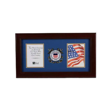 U.S. Flag Store's U.S. Coast Guard Medallion Double Picture Frame is designed to hold 2 pictures. These 4-Inch by 6-Inch pictures are set into a double layer of Blue matting with Gold trim. The frame is made from Mahogany colored wood, and the outside dimensions measure 10-Inches by 18-Inches. The U.S. Coast Guard Medallion 4-Inch by 6-Inch Double Picture Frame is perfect for proudly displaying the pictures of an individual who is serving, or has served in the U.S. Coast Guard.
