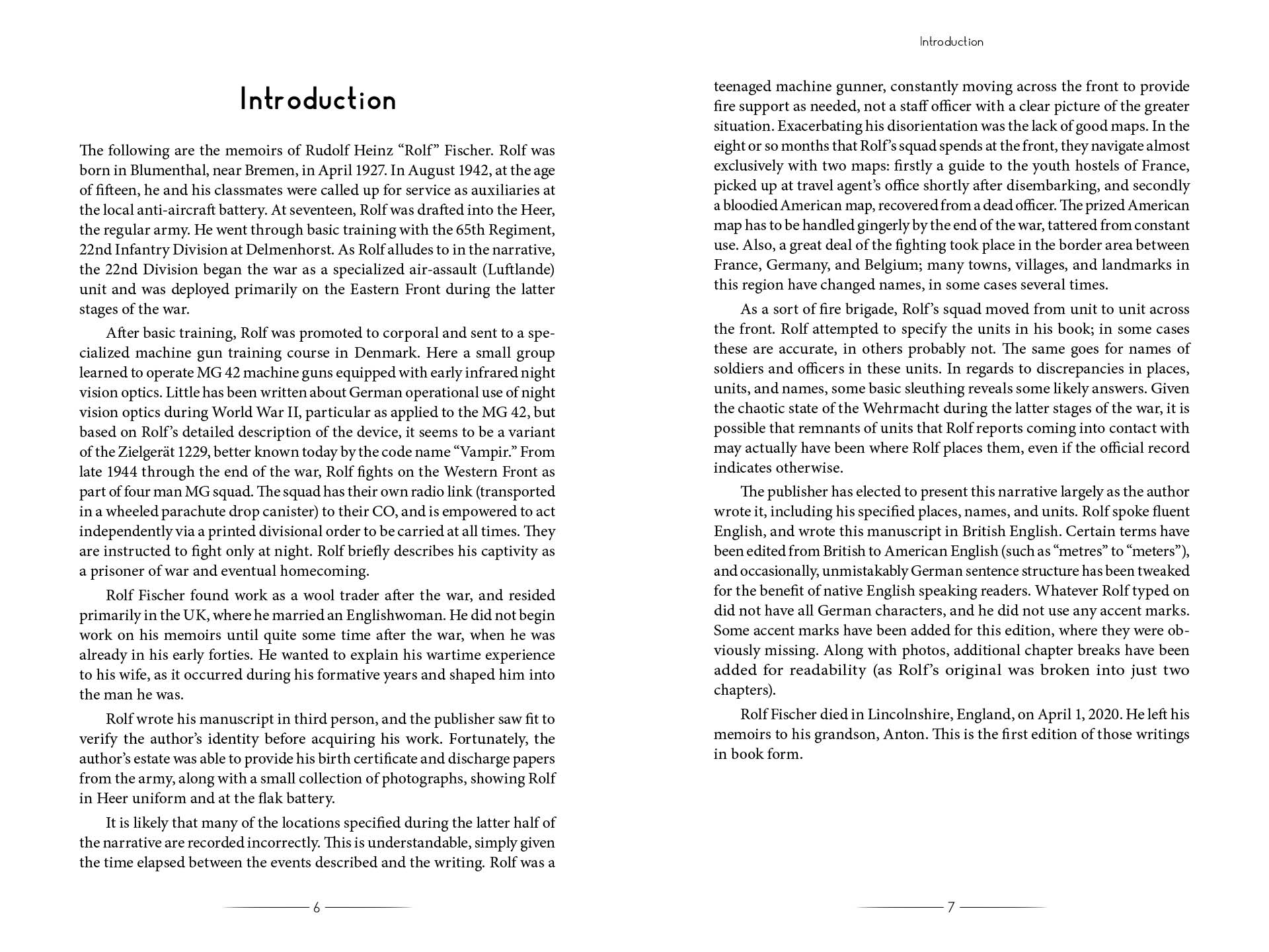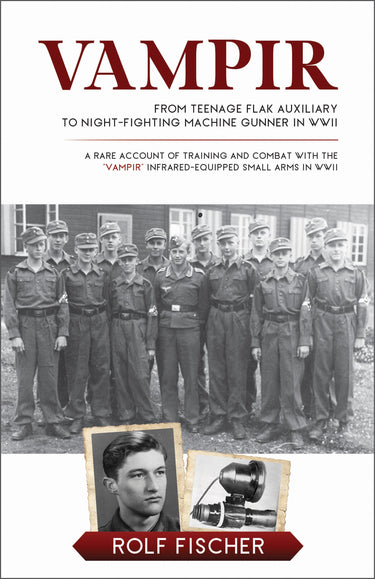 At age 17 Rolf is called up to the regular army and is sent to basic training with the 65th Regiment, 22 Luftlande Infanterie Division, at Delmenhorst. From there, he is sent to a specialized machine gun–training facility in Denmark. Here Rolf and other handpicked recruits are taught to use MG 42s equipped with infrared optics. This early night-fighting gear was sometimes referred to by the Germans as “Vampir” (Vampire). Rolf provides an in-depth description of the equipment and its usage. Upon completion of the course, Rolf (now a corporal) and his squad are deployed on the Western Front, where they operate as an independent fire team, moving from unit to unit along the front. Rolf describes brutal combat in the Hürtgen Forest, supporting German paratroopers (Fallschirmjäger) in a desperate counterattack, and defending a position against dangerous US Army Rangers. He goes on to describe his surrender and captivity in a British POW camp. This is not a dry compilation of dates and figures; rather, it is an intense personal account of combat and comradeship in the deadly final acts of the Second World War.
