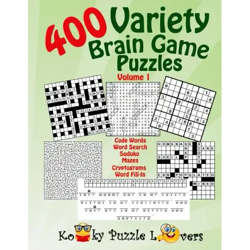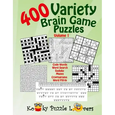 Variety Brain Game Puzzles include 1.) 26 Word Fill-in with 140 words per puzzle and starter word for each puzzle. 2.) 50 Word Search (17x17) grid with 38 words per puzzle and all are themed. 3.) 50 Code Word Puzzles with 3 starter letters in each puzzle. 4.) 150 Sudoku Puzzles with 4 levels (very easy to hard). 5.) 100 Cryptograms with at least one starter letter in each puzzle (Quotes). 6). 25 mazes from easy to difficult. All puzzles can be easy or difficult depending on your expertise. These puzzles are NOT large print. These puzzles are NOT spiral bound.