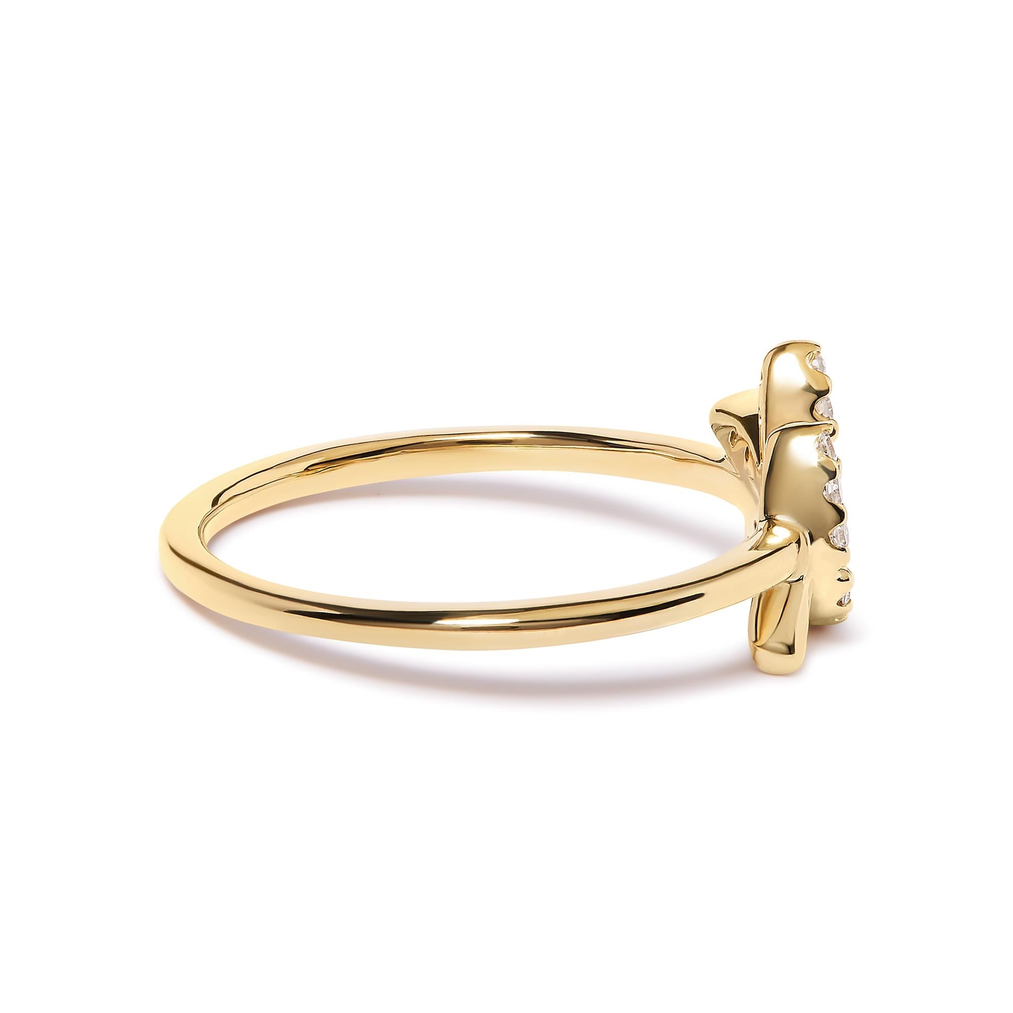 Introducing a mesmerizing masterpiece that effortlessly captures the essence of nature's beauty. This enchanting 10K Yellow Gold Leaf and Branch Ring, adorned with 15 dazzling round diamonds, is a symbol of elegance and grace. Crafted with precision, the intricate leaf design sets the stage for the shimmering diamonds, each meticulously placed in a pave setting. With a total diamond weight of 1/10 cttw, these natural diamonds showcase a captivating H-I color and I1-I2 clarity. Perfectly sized at ring size 7, this exquisite piece is designed for the discerning woman who appreciates the finer things in life. Indulge in the allure of this stunning ring and let it be a testament to your impeccable style and taste.
