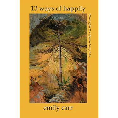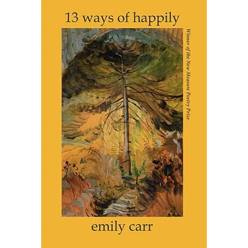 WINNER OF THE NEW MEASURE POETRY PRIZE "If ostranenie-to make strange-is the mandate of contemporary poetry, EMILY CARR has achieved this both brilliantly and beautifully. Kaleidoscopic in its glimmering slivers, the life she brings us is built of charged familiars slightly and completely changed: the sun turns on its stem; the stallion rolls in a pasture of blue ether. Although she references poetic antecedents from Wallace Stevens and William Carlos Williams to Joan Retallack and Mary Ruefle, it's not their voices, but their facility for invention, itself here reinvented, that keeps waking us up into a world sometimes alarming, often unsettling, and always careening until we, too, arrive 'delirious & shredded, sailing sideways through the greenly ravished vowels.'"-COLE SWENSEN "The poems of Emily Carr's 13 WAYS OF HAPPILY are like the butterflies of which she writes, "all-mond & a-mind white an ecstasy of crystalline palimpsest" sprouting "wings in the mind." They waver across imagination's field, alight on detail or insight, "flimmer on the dream's / cobweb." God and angels in wry company with the "plush octopus," the particular songbird, the Pepsi ad. Carr is alert to the environmental "surround," her poems delicate fronds of the observable world as it touches upon the window of inner plane. One reads a Carr poem first in wonder, for each poem is a tensile condensation that startles then dazzles. One returns, though, to ponder the profound stillness at the heart of 13 WAYS OF HAPPILY." -CYNTHIA HOGUE "What I find most appealing is that this book seems a living sensibility, as if I can feel its vibrancy in my hands. It has the intellectual curiosity and linguistic verve that power so much current poetry, but without any cynical disdain for traditional lyricism and figurative language. In fact, its fractured, episodic nature seems to push metaphor toward fresh ways of honoring both the microcosmic and the metaphysical, toward places where "phytoplankton in a raindrop echo" and "love . . . is a sail at the end of the world." The overall effect is expansive and exotic-a "mirage of buoyant polyglot" that remains grounded in immediate sensory and emotive experience, yet channels and extends that experience throughout even the most self-conscious formal innovation. There is a brilliant mind at work here, and an open heart-and the result is strangely beautiful."-MARK COX EMILY CARR'S first book, DIRECTIONS FOR FLYING (Furniture Press), was the winner of the 2009 FURNITURE PRESS POETRY PRIZE. Her chapbook, THE STORY WILL FIX YOU IT IS THERE OUTSIDE YOUR &, was published in Toadlily Press's 2009 Quartet Series. In 2010, Emily was a Poetry Fellow at the Vermont Studio Center & Writer in Residence at the Jack Kerouac House. You can read her work in recent issues of PRAIRIE SCHOONER, THE SPOON RIVER POETRY REVIEW, HAYDEN'S FERRY REVIEW, THE JOURNAL, BOMBAY GIN, MARGIE, INTERIM, CAKETRAIN, PHOEBE, FOURTEEN HILLS, THE CAPILANO REVIEW, SO TO SPEAK, DUSIE, and VERSAL.