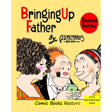 Bringing Up Father is an American comic strip created by cartoonist George McManus. ---Here the second series edited in 1919. New lay-out by Comic Books Restore. ---The strip centers on an immigrant Irishman named Jiggs, a former hod carrier who came into wealth in the United States by winning a million dollars in a sweepstakes. ---- Now nouveau-riche, he still longs to revert to his former working class habits and lifestyle. His constant attempts to sneak out with his old gang of boisterous, rough-edged pals, eat corned beef and cabbage (known regionally as "Jiggs dinner"), and hang out at the local tavern were often thwarted by Maggie, his formidable, social-climbing (and rolling-pin wielding) harridan of a wife, their lovely young daughter Nora, and infrequently their lazy son Ethelbert, later known as Sonny. Also a character presented in the strip (portrayed as a miserly borrower) was named, fittingly, Titus Canby ("tight as can be").