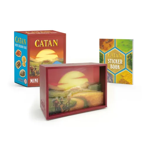 - Specifications: Includes a 3-inch shadow box of the CATAN artwork and an enclosed sticker book.