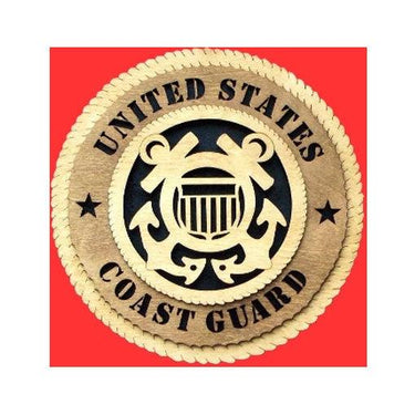 The Coast Guard Wall Plaque is Completely handmade from start to finish, this collectible piece comes 12” in diameter in a truly unique 3D design. If you prefer a smaller variety, the plaque is also offered in a 9” diameter option. The United States Coast Guard emblem stands 1/4” off of the backboard, while the inner ring on which the text is printed stands 1/8” from the backboard. The staggering placement is what gives the 3D appearance.Our artist will cut each piece from imported Baltic Birch trees, then stain the plaque an Early American hue. The black background forces the completed piece into full view, raising the crest of the United States Coast Guard to full prominence. Each level is layered, so the observer is looking through the cut out design of this intricately made piece.